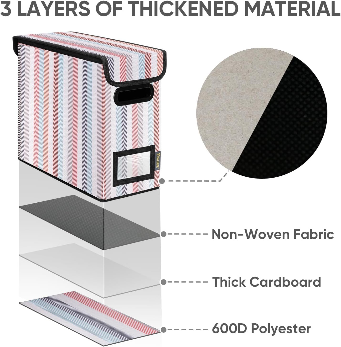- [DURABLE MATERIAL] The outer layer of our filing box is crafted from high-quality polyester fabric and reinforced with thick cardboard in the middle. This construction ensures that the box maintains its shape and provides better bearing capacity for important documents and files. Its textured appearance can also serve as a stylish decorative element in any office or home