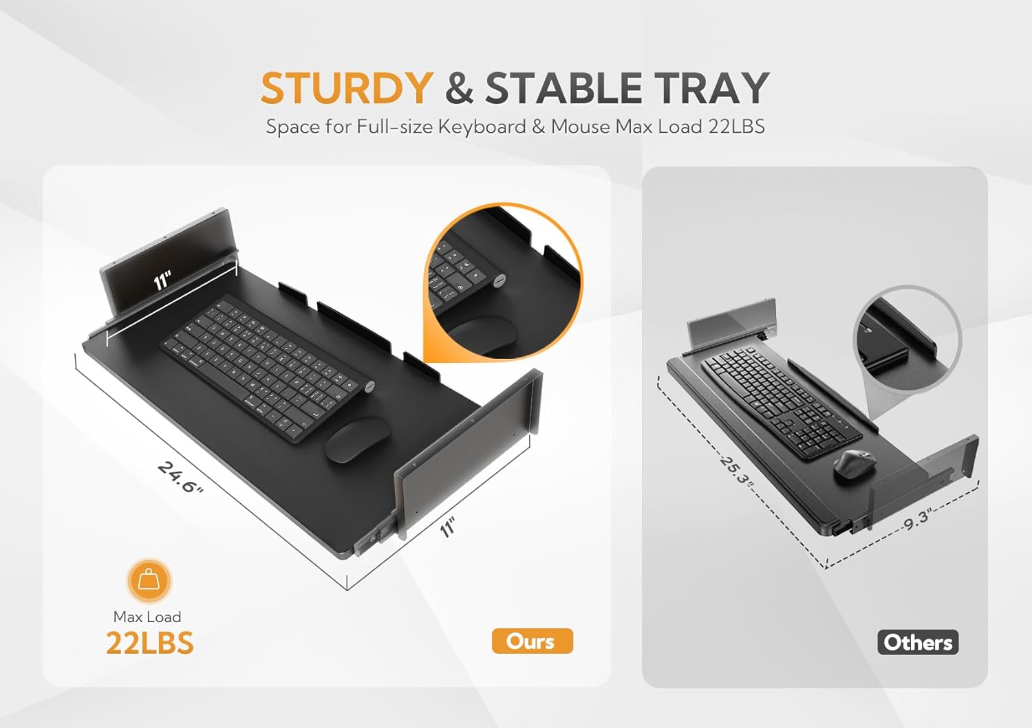 - Spacious Keyboard Tray: Our expansive 26.8" x 9.8" keyboard tray fits a full-size keyboard and mouse with extra room for additional comfort. It helps keep your wrists in a natural position, reducing strain for better long-term comfort.