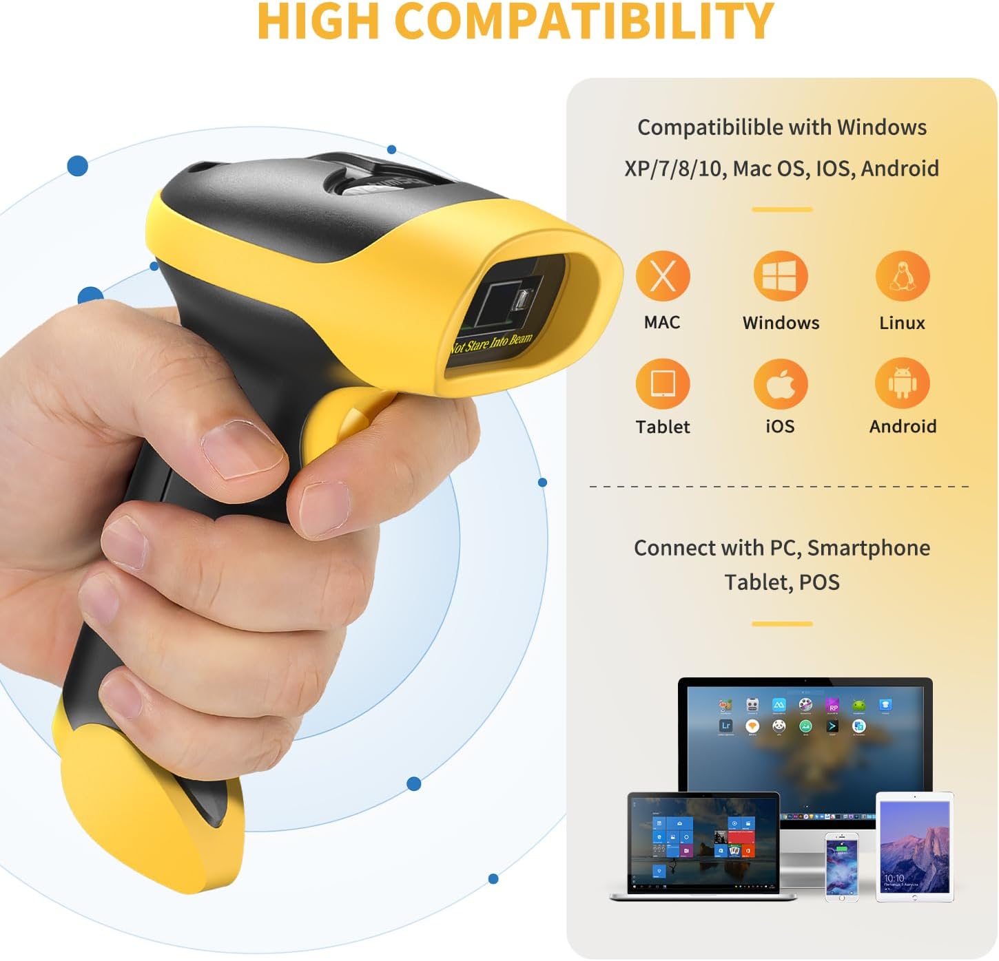 - ▲Professional Anti-Shock Design - Made of great ABS+PC materials,high shock-resistant, and the silicone protective cover can avoid the scratches and friction while falling from the height of 6.57 feet; the technical of IP54 sturdy which protect the wireless barcode scanner from dust and moisture.