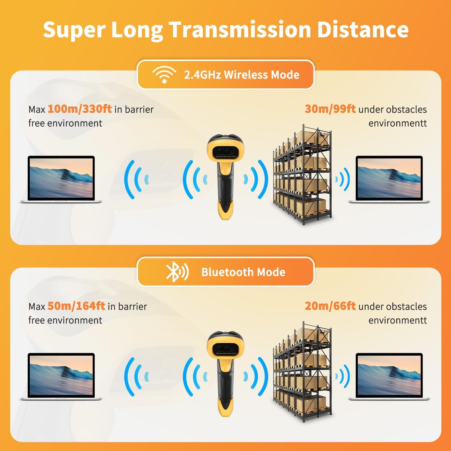 - ▲Auto Scanning & Storage Mode - Manual Scan & Auto-sensing Scan & Continuous Scan. Two working mode: Instant upload mode / storage mode. Scan and store barcodes, then update the data to your device when you come back entering the wireless transmission range. Sometimes the self-sensing scanning function is in the inactive stage, please contact us and be at your service at any time.