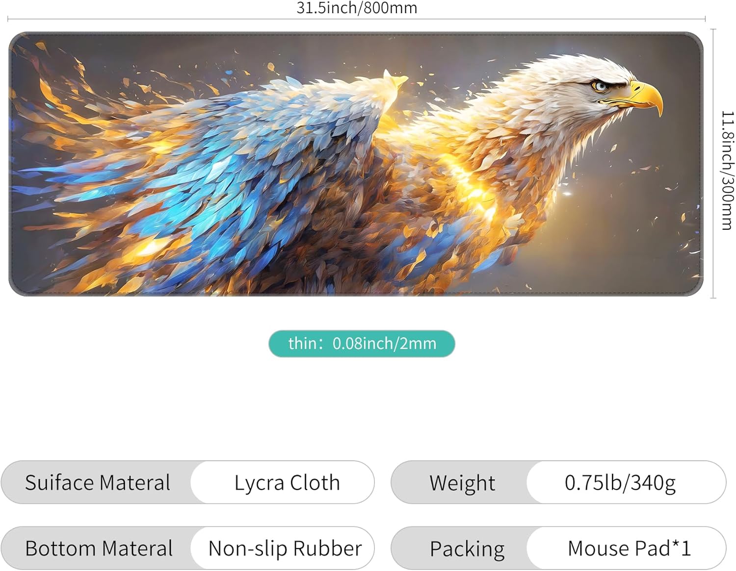Dynippy Thin Extended Gaming Mouse Pad (31.5 * 11.8 * 0.08 inch) with Stitched Edges Large Mousepad Long XXL Keyboard and Mouse pad Desk Mat for Gaming Office & Home - Golden Eagle Soars