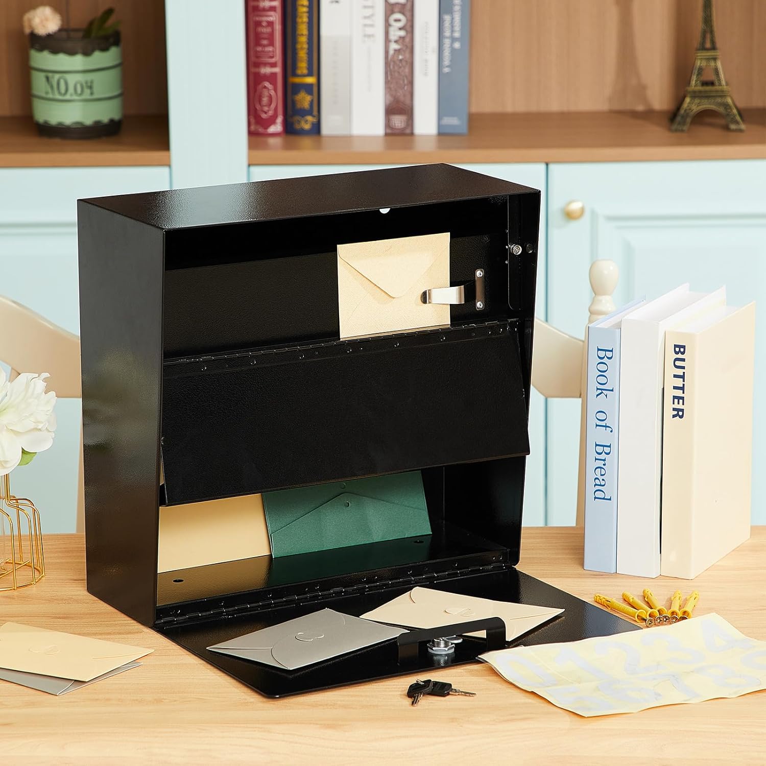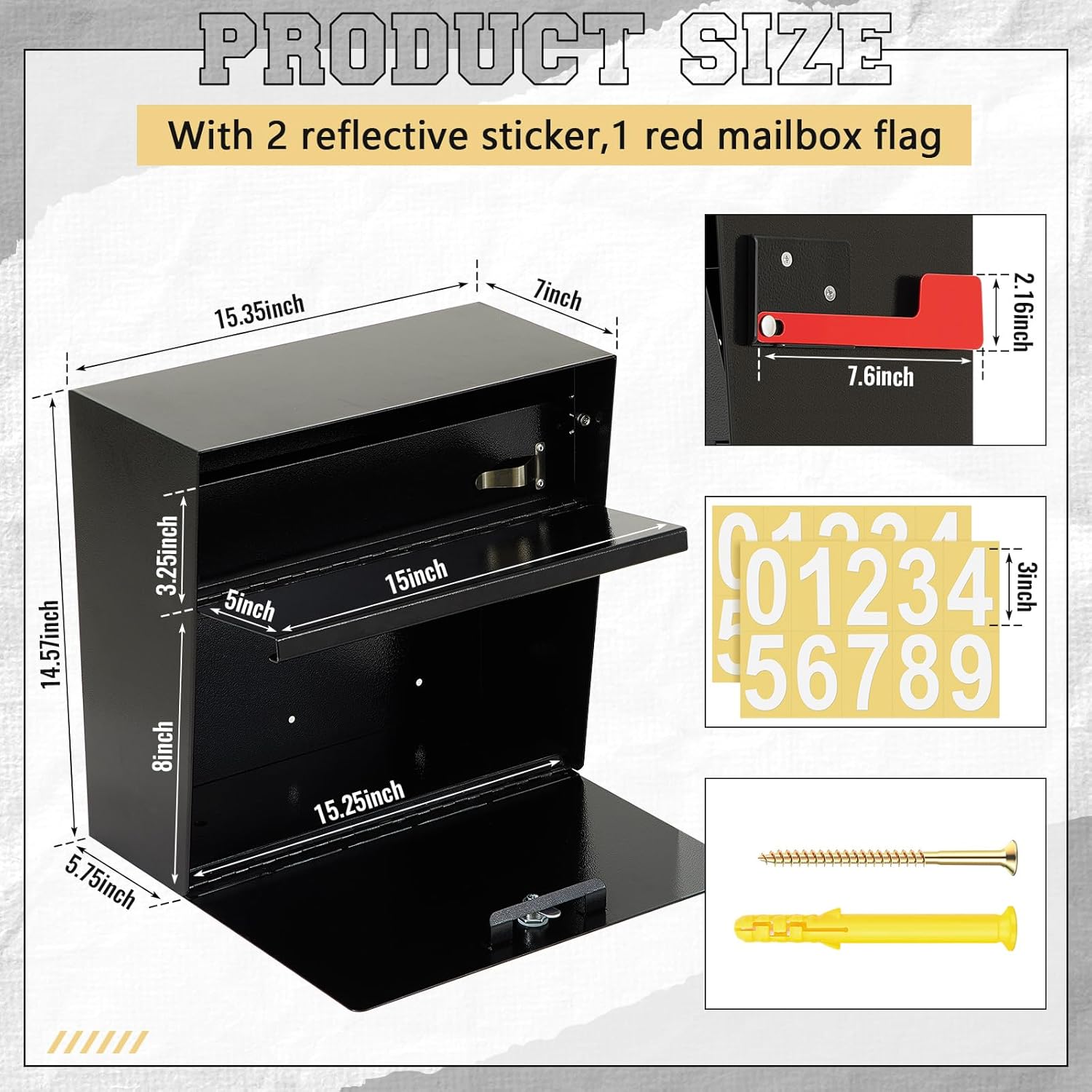 Extra Large Wall Mount Mailboxes for Outside 15.35 x 15 x 7 Inches Locking Security Mail Box Galvanized Steel Wall Mailbox Large Capacity Post Box with Key Lock and Reflective Stickers(Black)