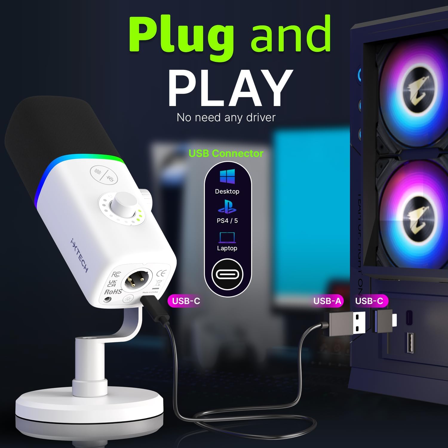 IXTECH Gaming USB Microphone for PC, Noise Cancellation Condenser Mic for Podcasts and Video Streaming with Tripod Stand, Pop Filter, Shock Mount, Gain Control, RGB Lights, Quiet Mute Button (White)