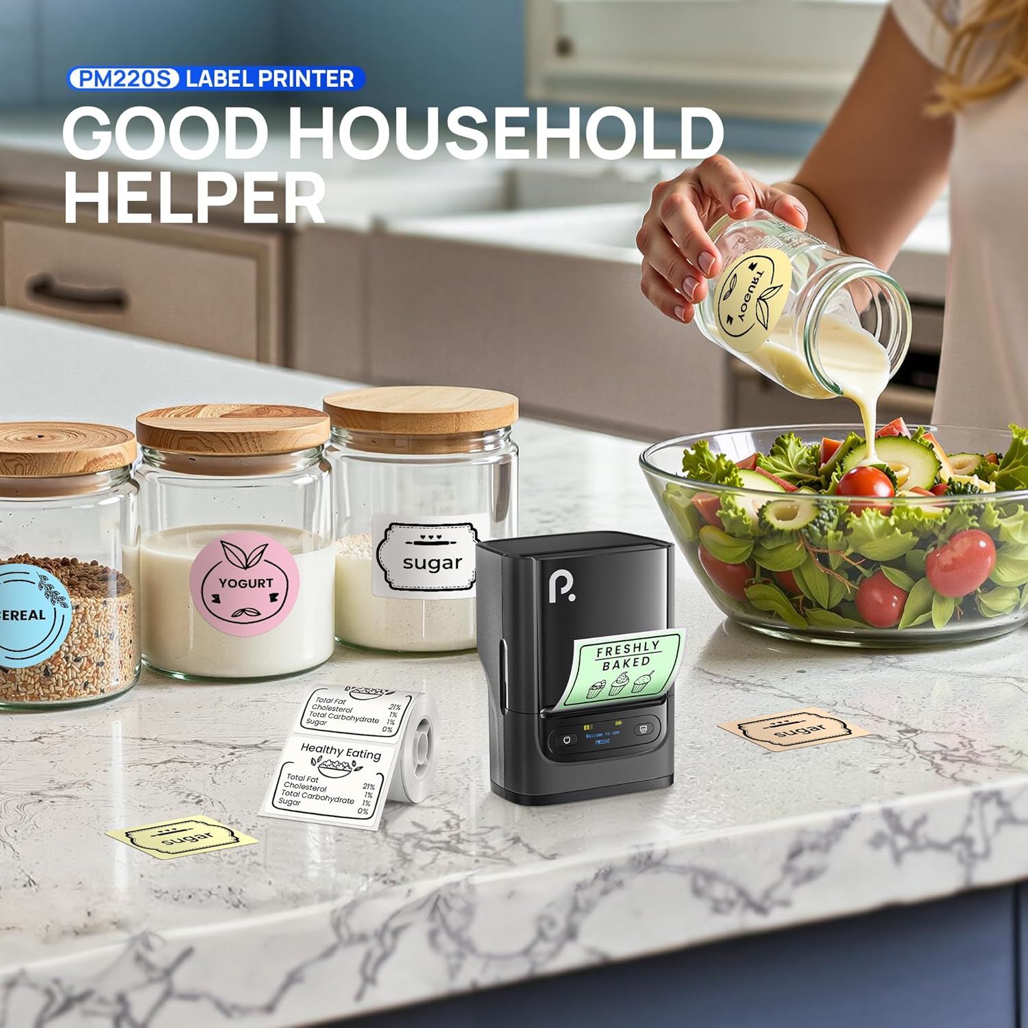 - 【Powerful APP】PM220S label maker machine with tape comes with free label templates and can set up your own templates.The thermal printer allows you to customize and format labels, supporting various features such as QR codes, Barcode Labels, Tables, Materials, Time, Figures,Ttext, Icons, etc. This label printer APP included more than 90 +Fonts, 14+ Languages, 450+ Material.Tips: We recommend using our specialized labels for a better printing experience. Please do not tear or destruct the green sticker on the back of the specialized label strip, otherwise it will affect the printing effect.
