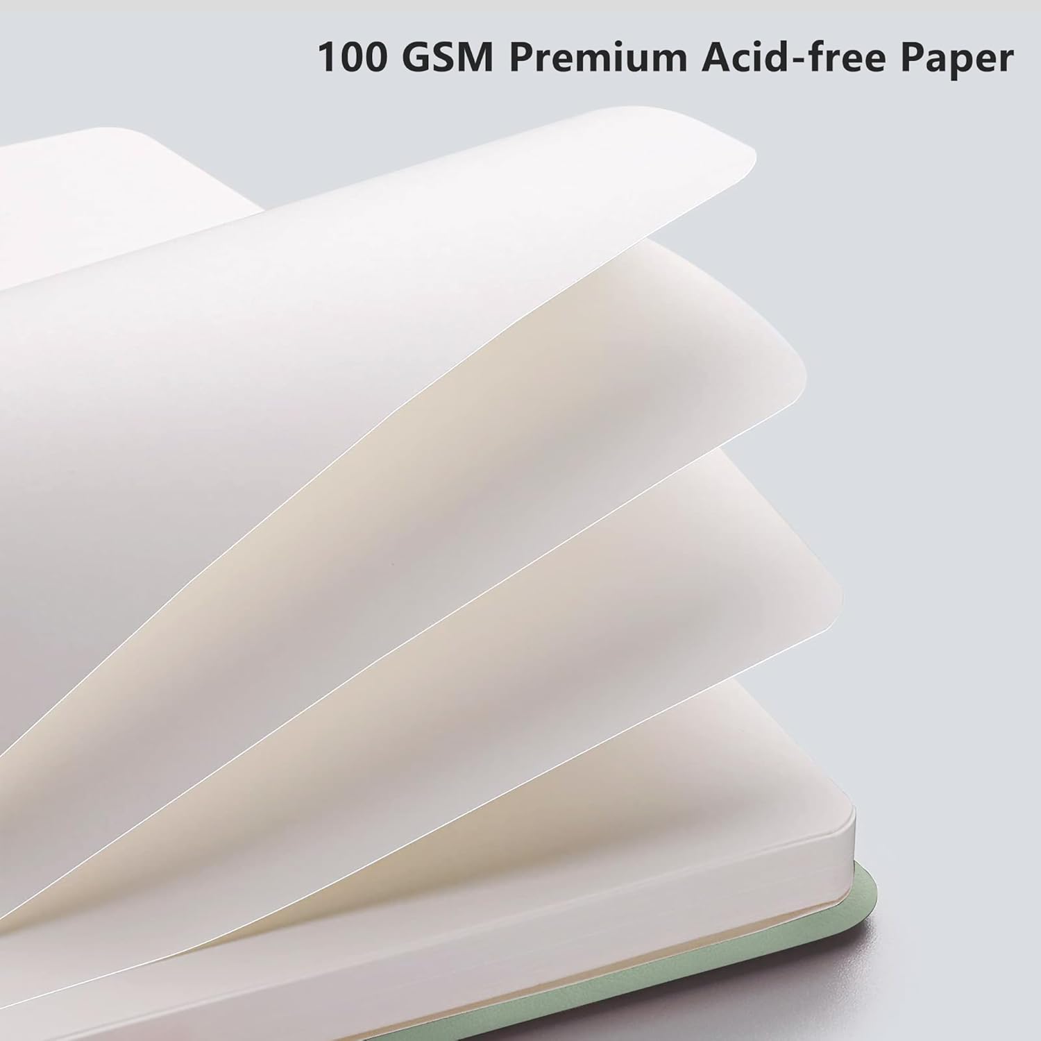 - PREMIUM PAPER: Crafted with time-resistant 100 GSM paper, our blank journal notebook preserves thoughts flawlessly while resisting ghosting/bleed-through with most pens. Acid-free material ensures long-term preservation, and its smooth surface enhances writing clarity - blending durability and premium performance