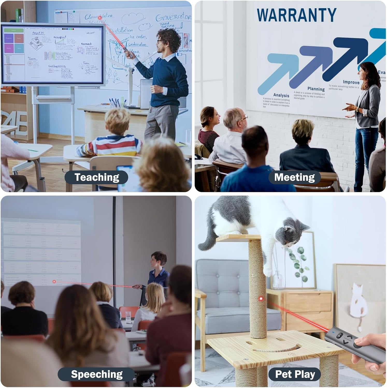 - 【LONG RANGE WIRELESS CLICKER FOR PRESENTATIONS】The red light pointer for presentations can easily highlight key areas of the slides. The red light projection distance is up to 656 feet, the 2.4G wireless range is up to 100 feet, and the 360°flexible control allows you to freely and flexibly interact with the audience outside the screen