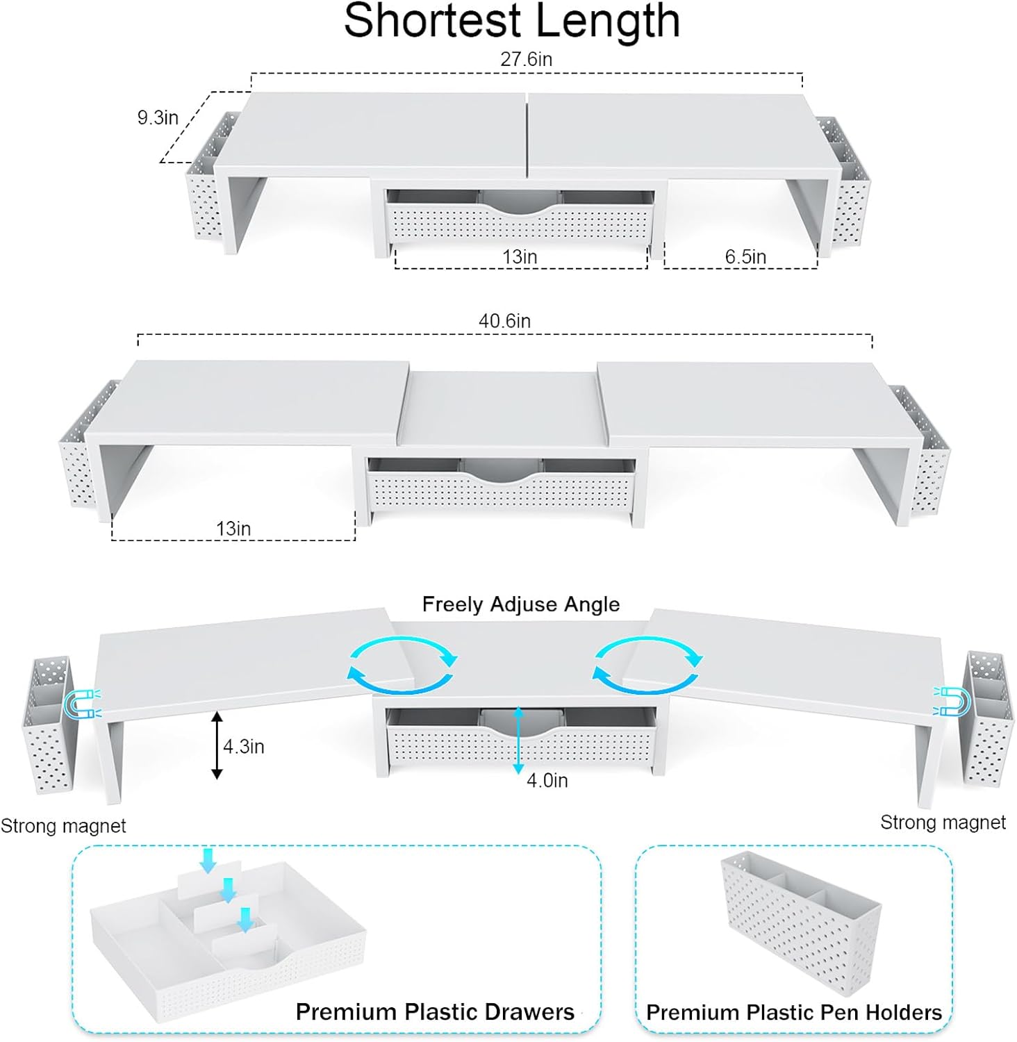 - 【Ample Storage Space】The dual monitor stand features two magnetic pen holders and a drawer, allowing you to easily organize your desk accessories and office supplies, keeping your workspace clear and tidy for easier access.