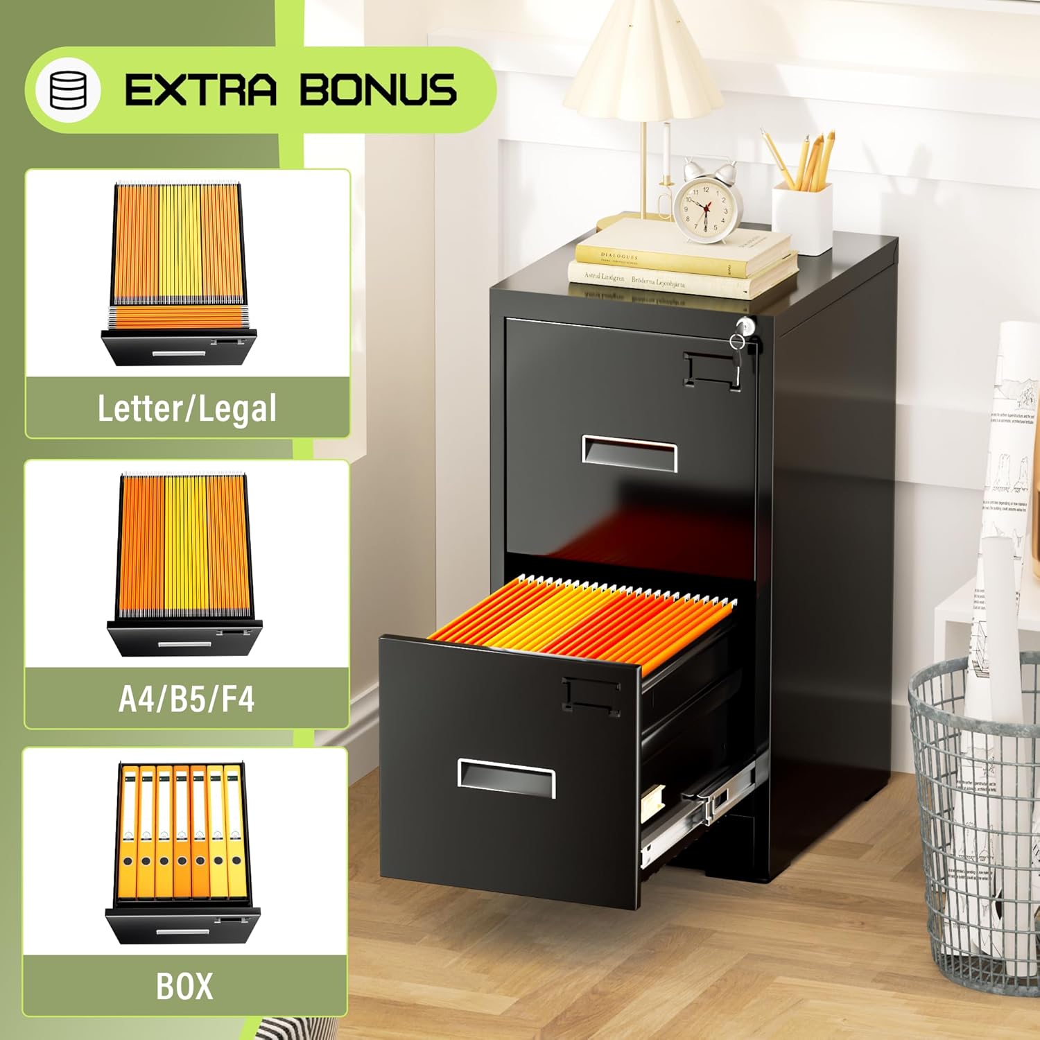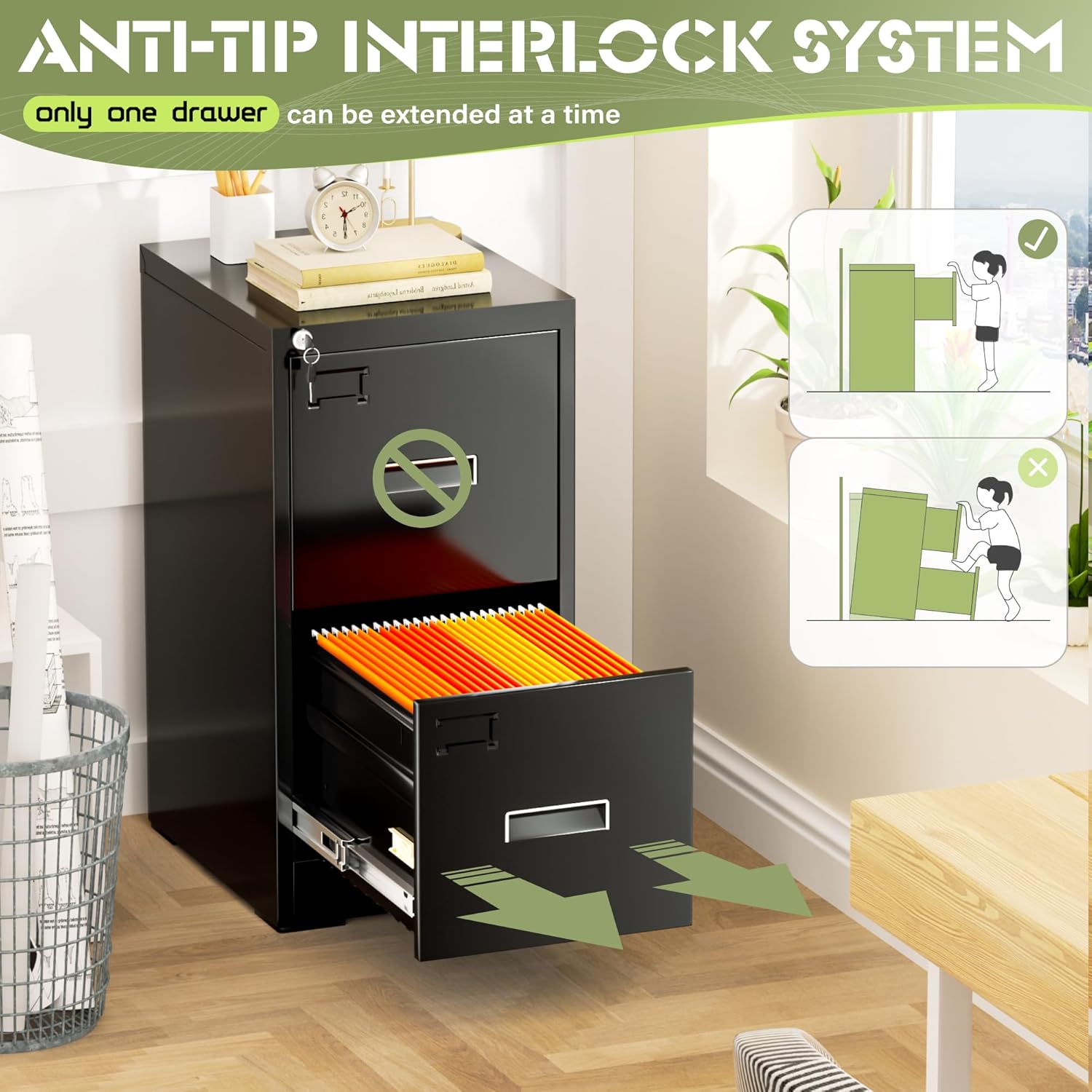 Crownland Lateral File Cabinet with 2 Drawers, 15" W Metal Lockable Office File Cabinets for Home Office- Stores Letter/Legal/A4/F4 Files(Black)