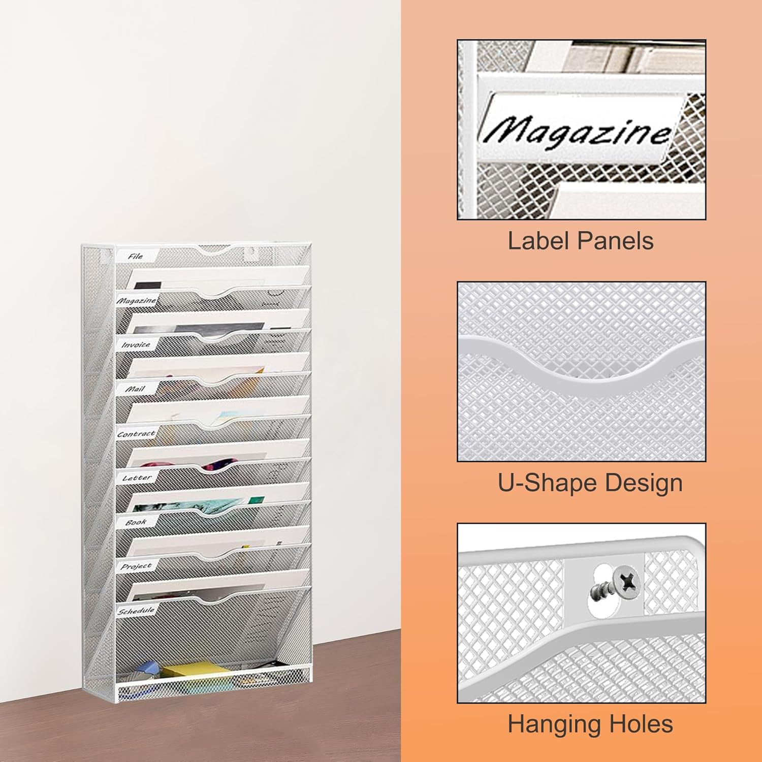 10 Tier Hanging Wall File Holder, Metal A4 Wall Mounted Document Holder, Vertical Hanging Mail Organizer, Magazine Storage Rack with Tray for Office Home Classroom, White