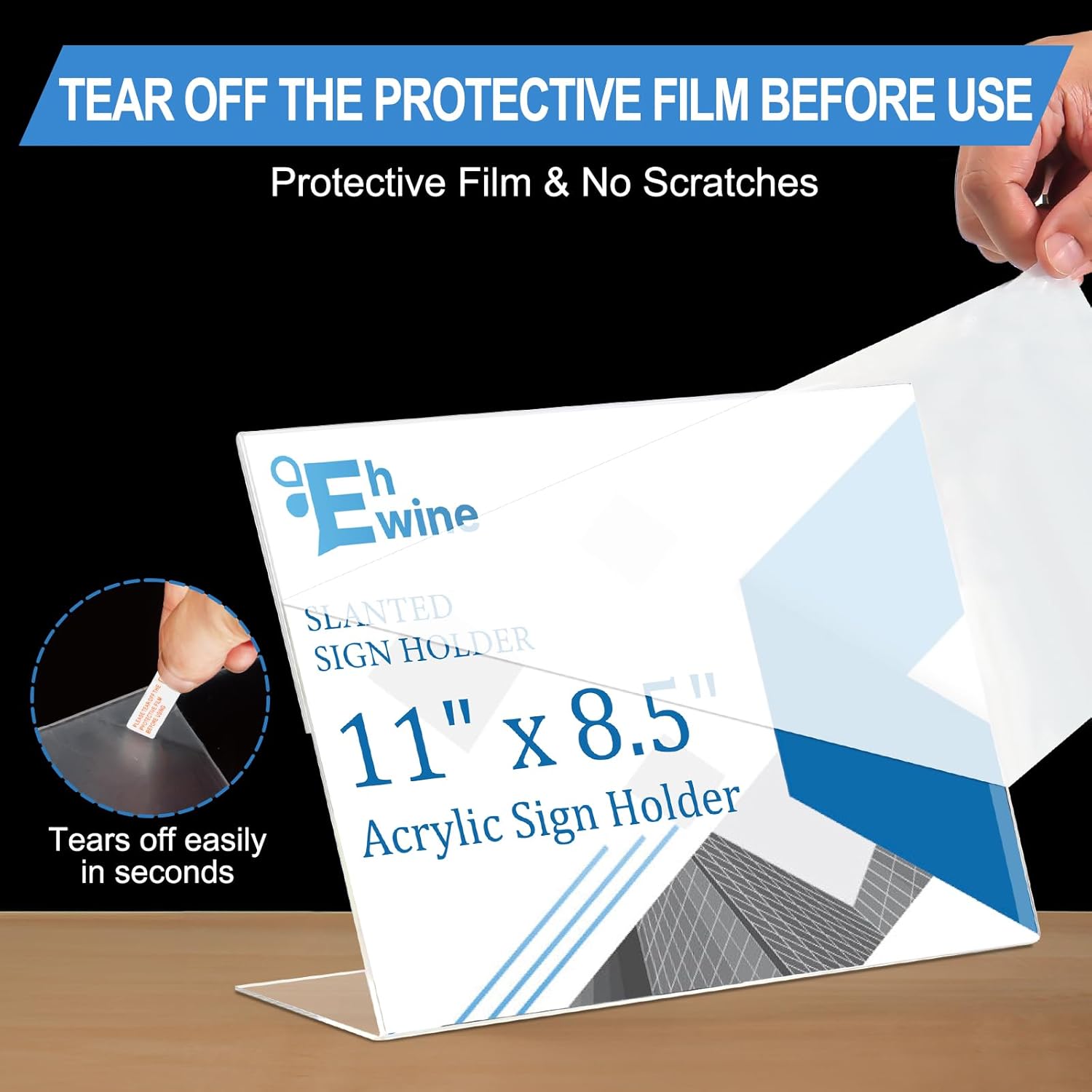 - Easy to Use: Insert 4 anti-slip pads into the base, Each of our Acrylic Sign Holder comes with a peel off film guide, follow the red arrows to peel off the film in seconds, and the plastic sign holder has an opening on its side for easy paper insertion