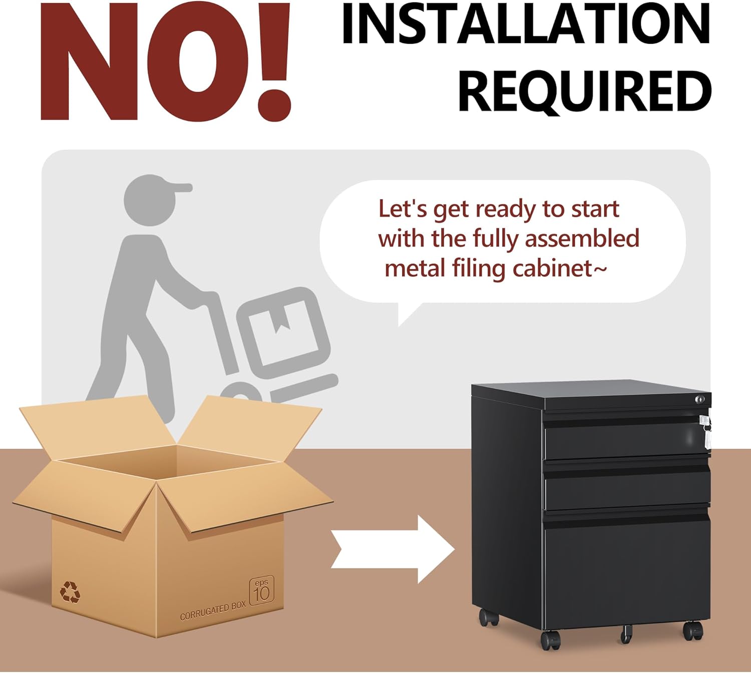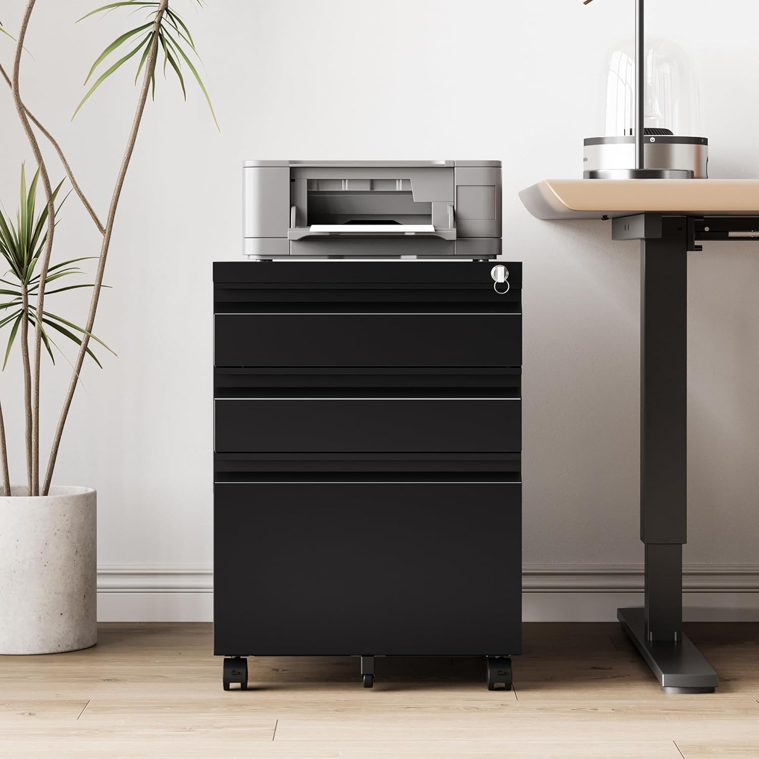 3 Drawer File Cabinet,Mobile Filing Cabinet with Lock and Wheels,Fully Assembled Metal Under Desk File Cabinets for A4/Letter/Legal Size(Black