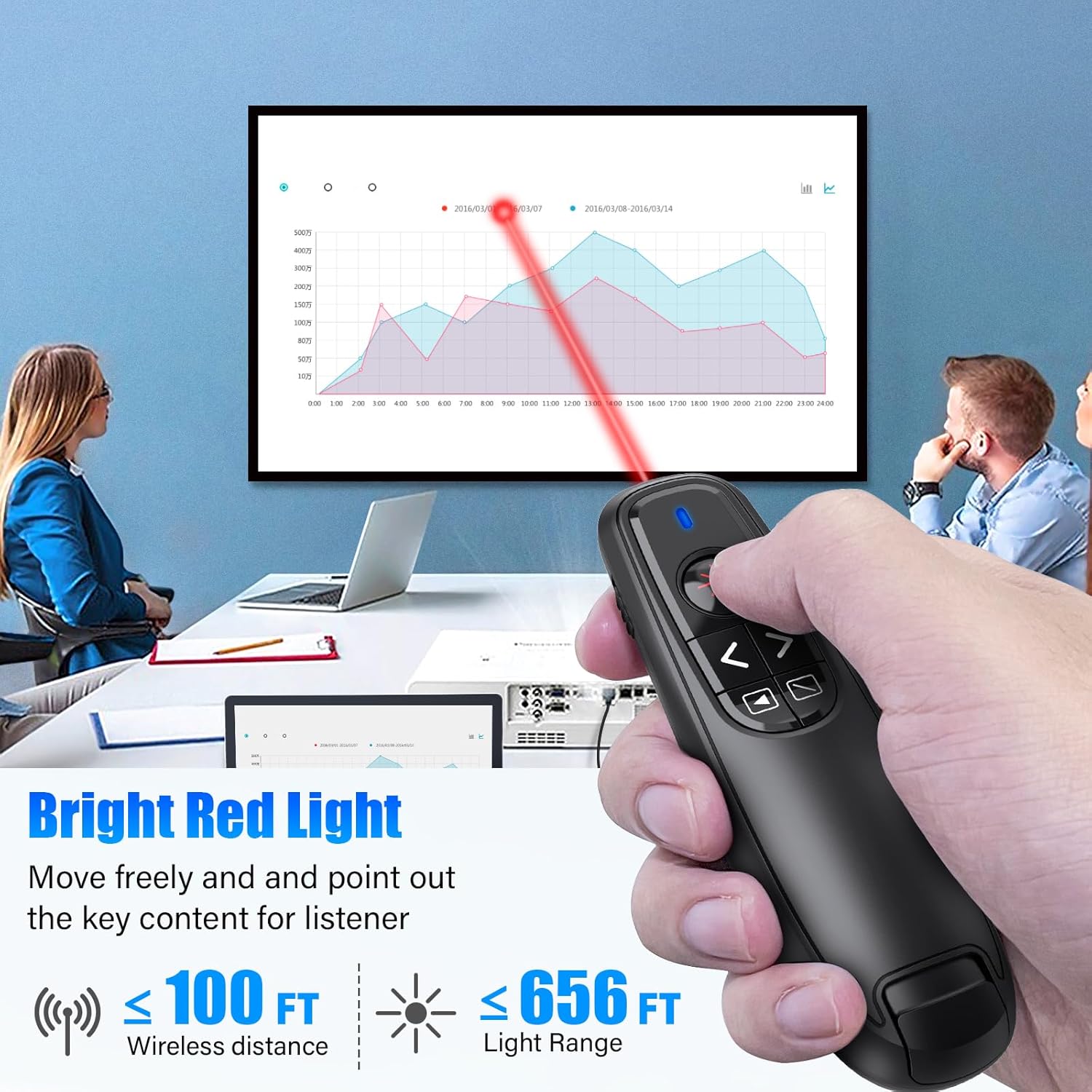 - BRIGHT RED LIGHT & LONG RANGE CONTROL: The slide advancer with laser pointer possess bright red laser which is easy to be seen clearly against most background(Not recommended for TV/LED/LCD screens), to highlight and point out the key part to for audience. The wireless remote control range of the slide clicker is up to 100ft while the red laser range is up to 656ft, which allows you to stroll around effortlessly and mingle with your audiences for greater impact in a large space.