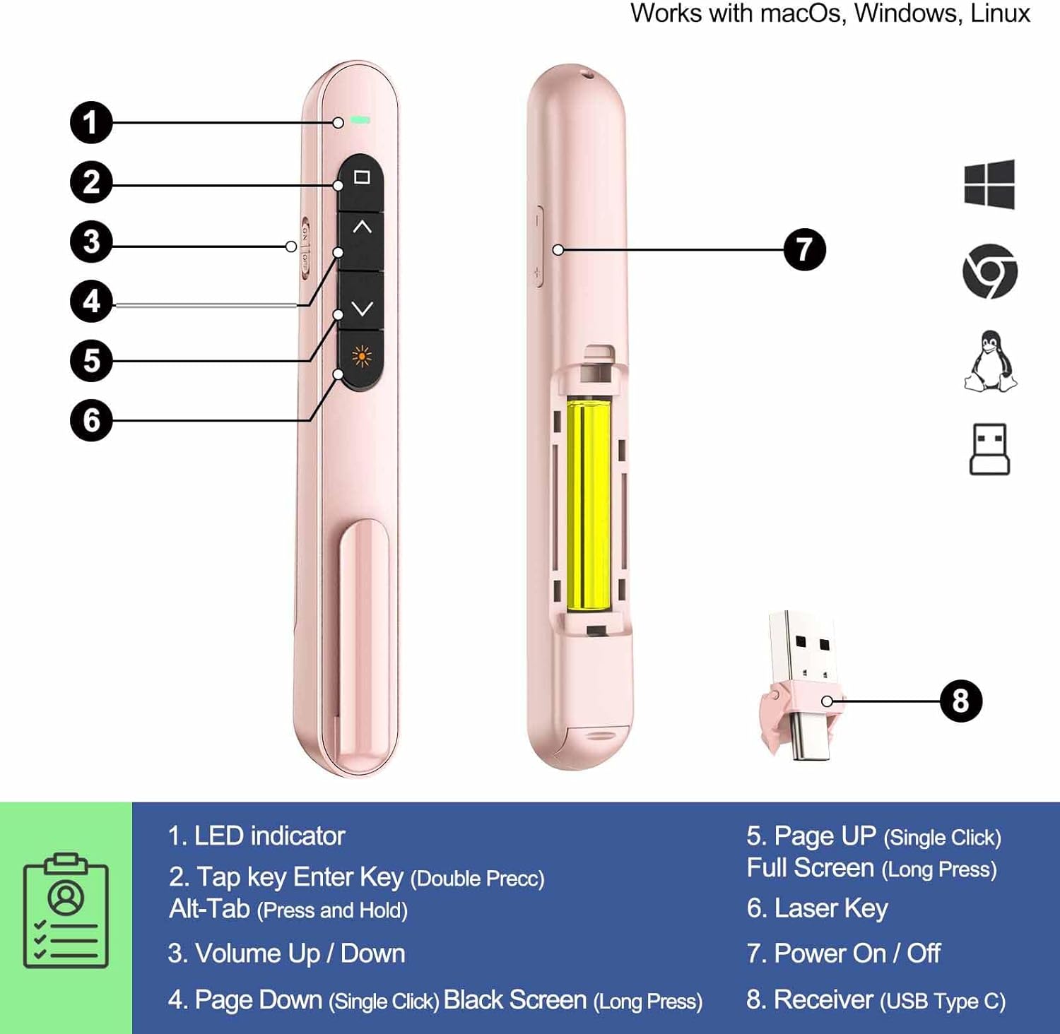- ă100M STABLE CONNECTION CONTROLăThis wireless presenter remote has a coverage range of up to 328 feet, you can walk out from behind the podium and move around the room, actively talk with the audience, make your lectures more interactive, and enjoy a stable presentation process