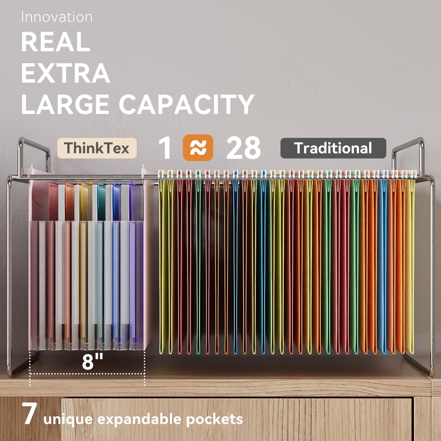 - CHEER UP YOUR FILE CABINET: ThinkTex innovative plastic hanging folder(Not suitable for Manila folders). Designed for letter size files and most standard files cabinets. 7 expandable pockets and 6 colorful dividers, large capacity