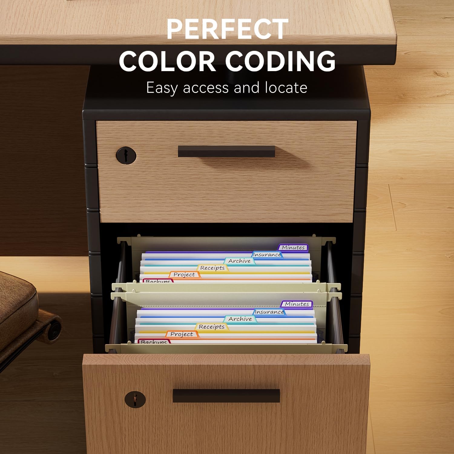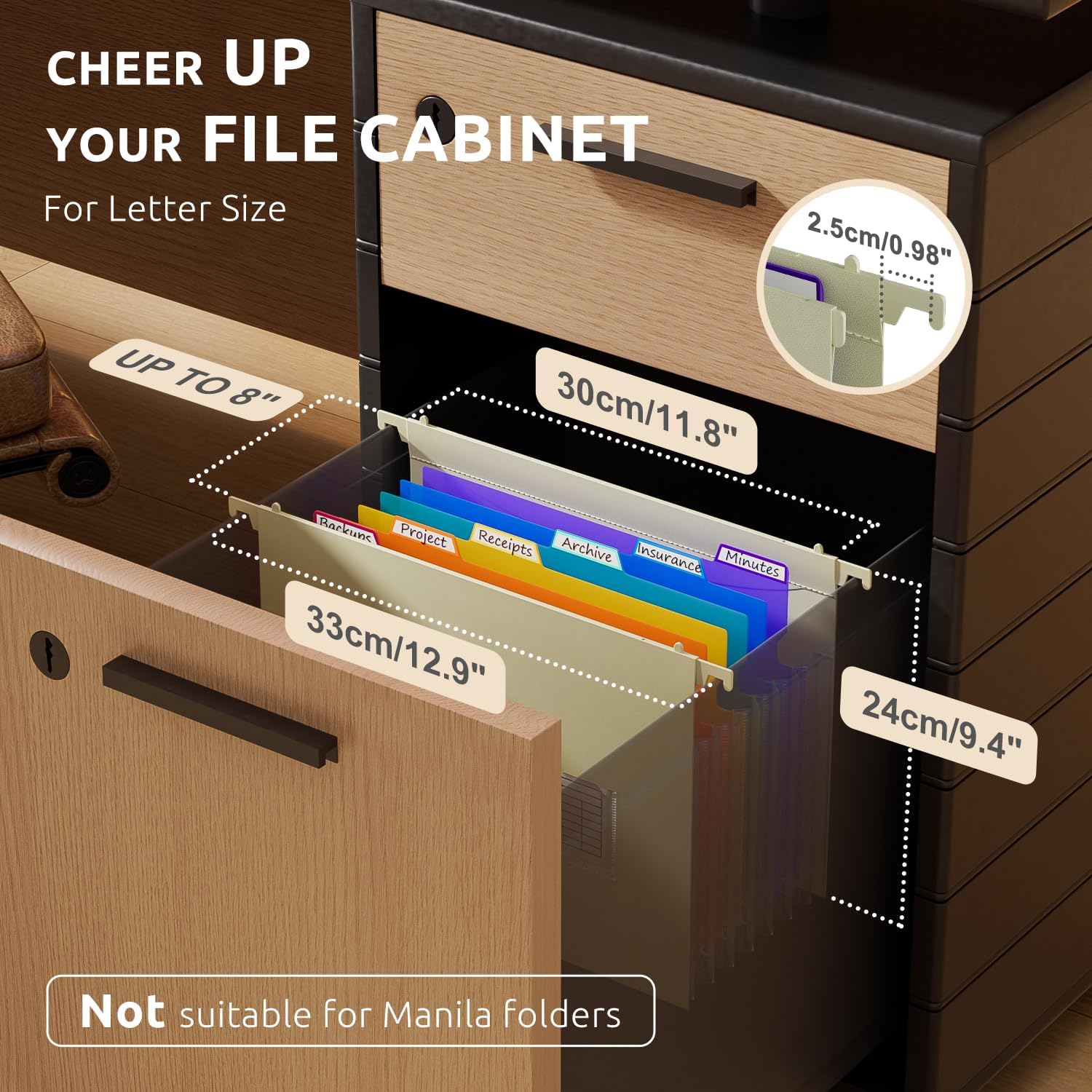 - CREATE OWN FILING SYSTEM : Bright labels light up the drawers. The hooks fit along the rails and glide effortlessly. Say goodbye to overflowing hanging files. Quickly find the files you want and close drawers without hindrance. It's the little things that make life easier