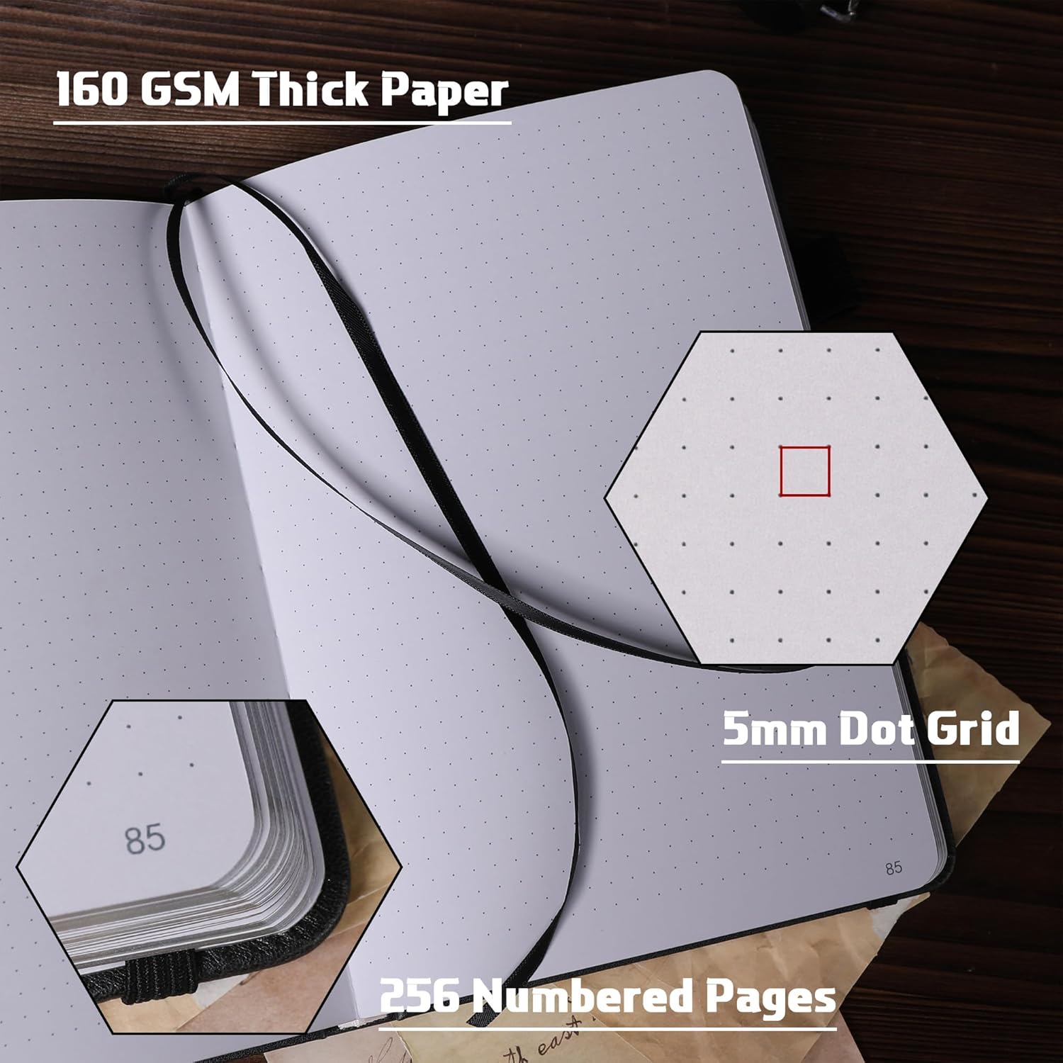 - A5 Hardcover Dotted Journal: The A5 Dot Matrix Notebook is the perfect combination of style and function. With an elasticated pen loop, two ribbon bookmarks, signature page, lanyard, and expandable inner back pocket, making this dot notebook a must-have for anyone looking to stay organized. Jot down your fun facts and thoughts in this special bullet point dot journal.
