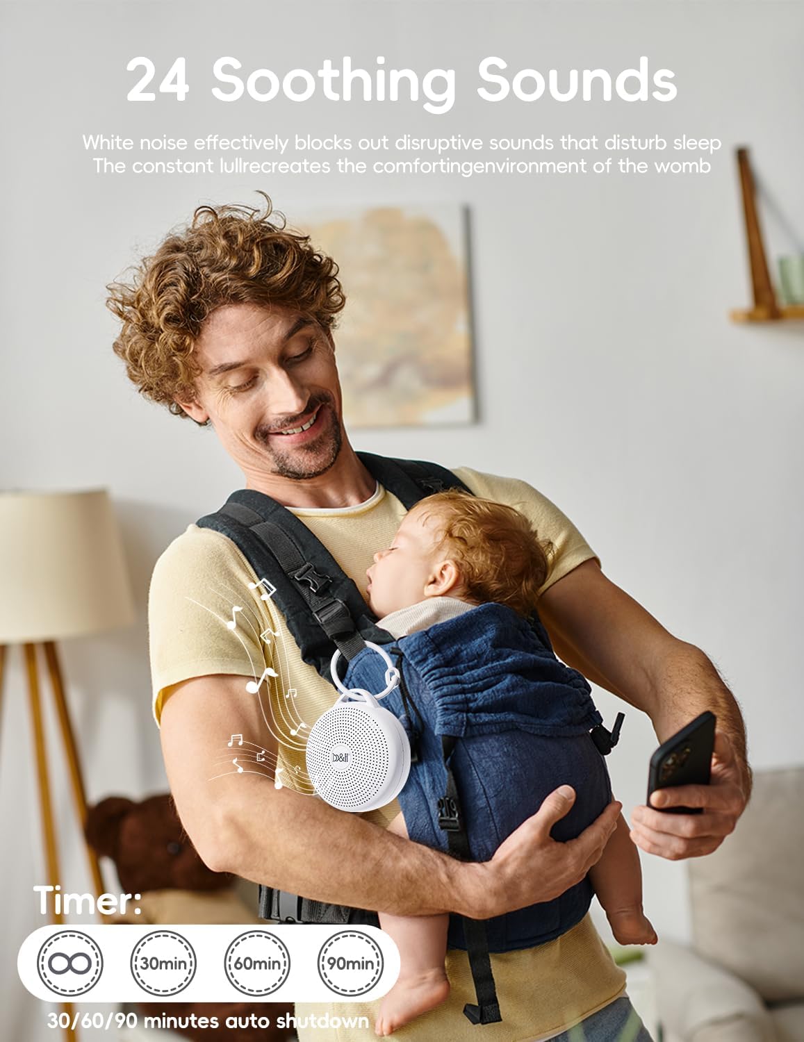 - The Best Sleep Sound Machine Designed For Baby and Parents: Baby Sound Machine designed for all things sleep, this white noise machine comes with favorable features: warm night light and colored light, 24 soothing sounds, recording function, customized timers, various volume levels, rechargeable battery, child-lock for safety, and even memory functions! This sound machine is effectively blocks out disruptive noises, making it easier for your baby and you to sleep undisturbed wherever you are.