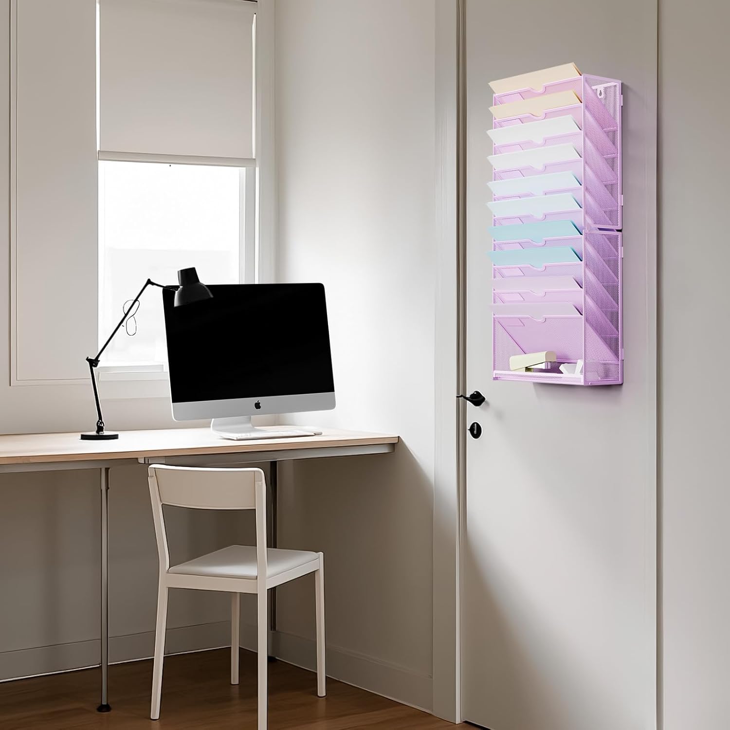 Marbrasse Wall File Holder 11-Tier Hanging Wall File Organizer, for Papers, Files Clipboard & Magazine Organizer, Wall Mount File Holder Great for Office Home (Purple)