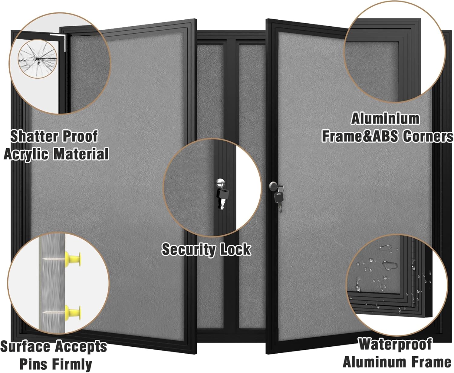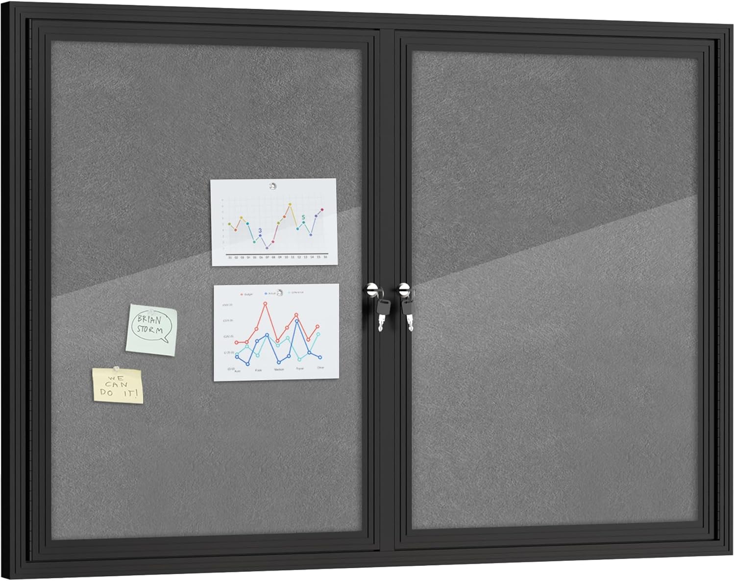 48"x34" Enclosed Bulletin Board, Outdoor Lockable Weather-Resistant Aluminum Cork Noticeboard for School & Office, Black Frame w/Grey Flet
