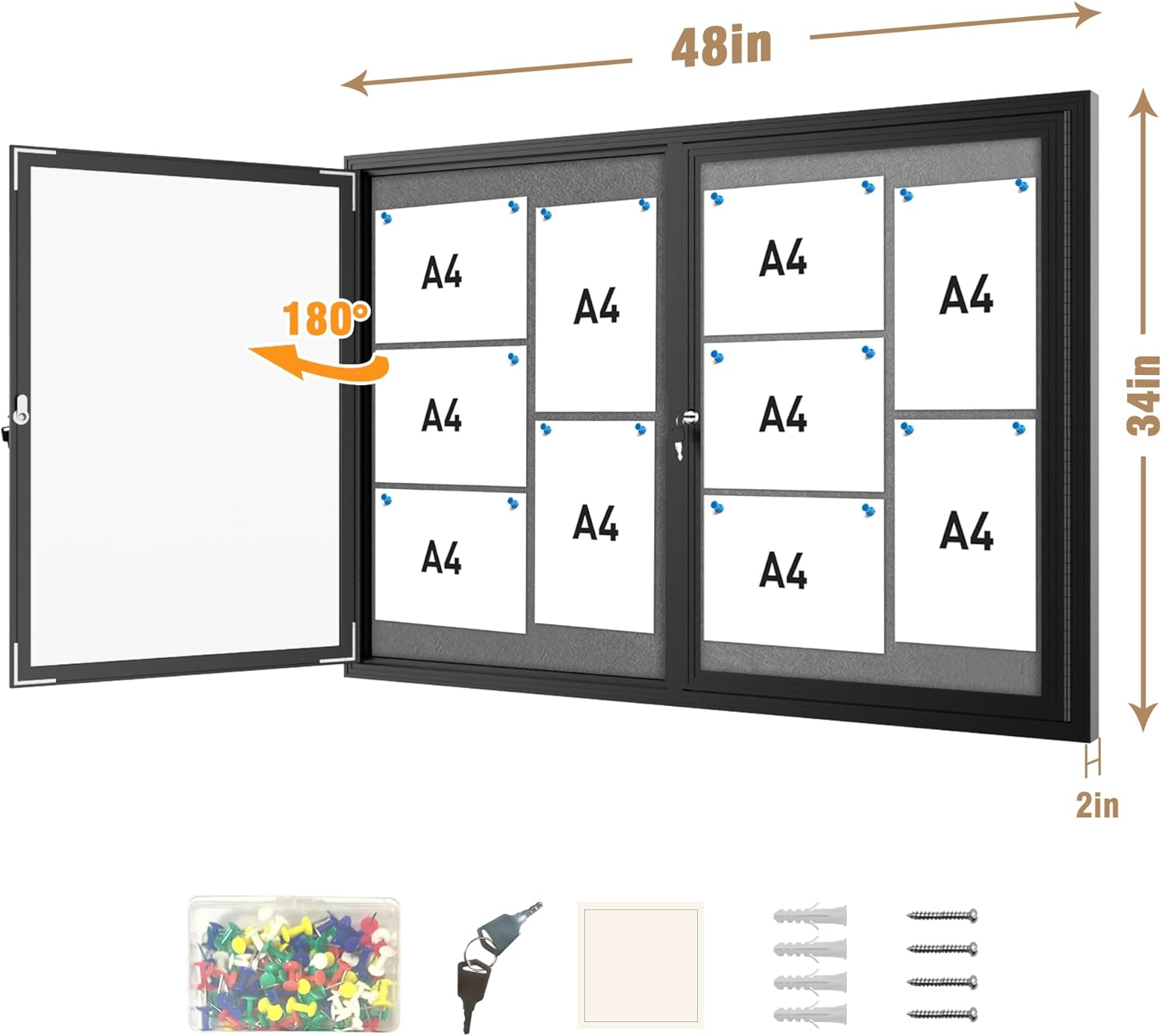 - 🌟✔【Optimal Dimensions】: The overall size of the enclosed bulletin board is 48" x 34" (frame included), with a lockable surface size of 46" x 32". You can display up to 6 A4 size documents at once. The package includes a fixing device and accessories (10 push pins).