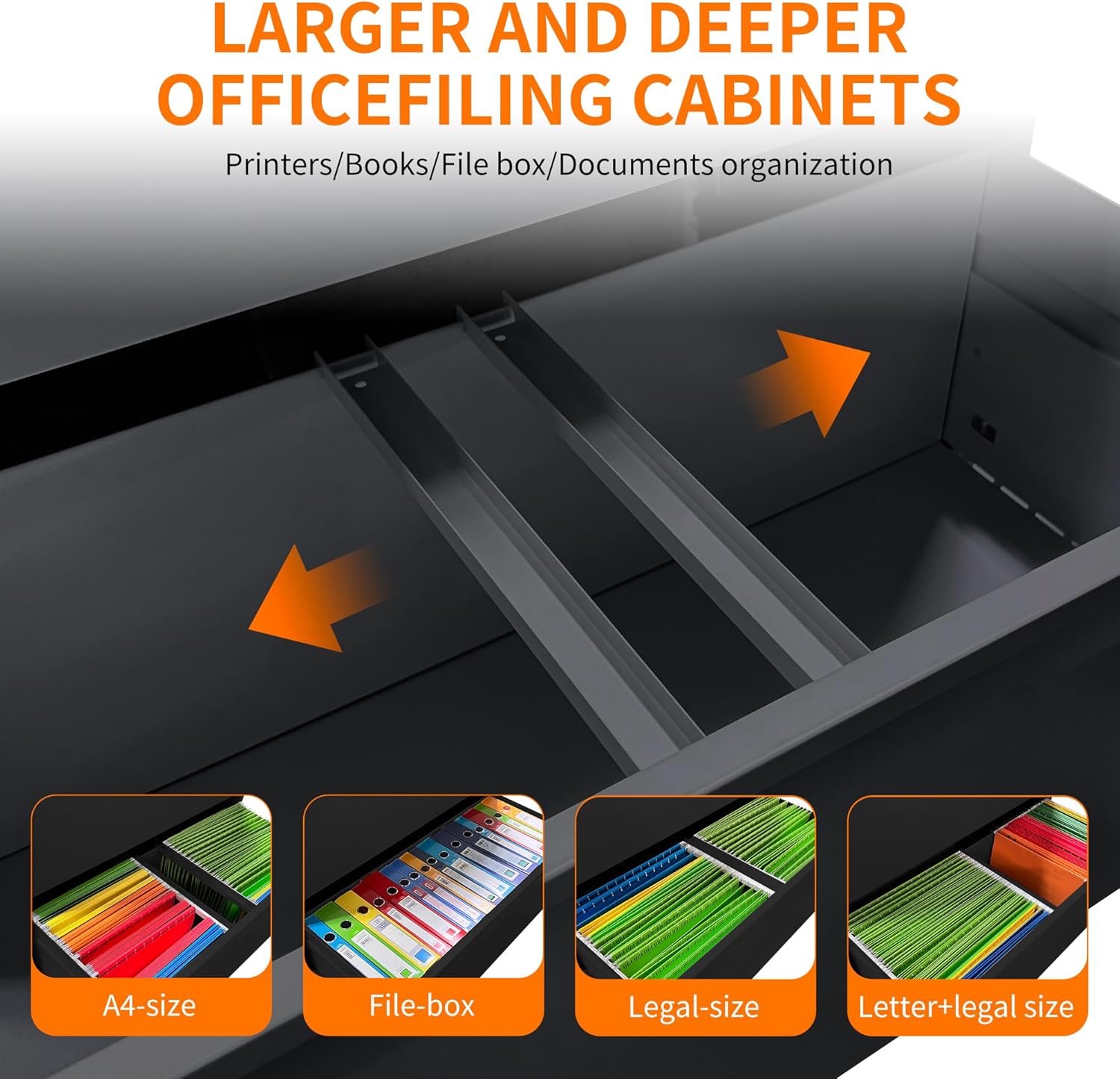 - 【Solid & Durable】Crafted from whole-in-one reinforced high-strength cold-rolled steel, this locking lateral file cabinet ensures remarkable sturdiness and longevity. Each drawer can bear a maximum load of up to 110lbs, showcasing its robust construction. The combination of a strong structure and a powder coating surface process makes this wide cabinet highly resistant to rust, scratches, and ensures easy cleaning, maintaining its pristine appearance over time.