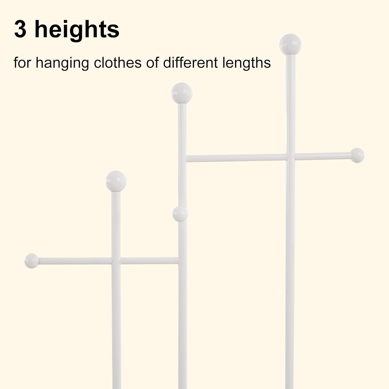 - Three-rod Design: Our garment rack features three rods set at different heights, making it ideal for family use; Additionally, this versatile design ensures optimal use of vertical space, allowing you to hang garments of various lengths—from long coats to short jackets—and accommodating different sizes effortlessly