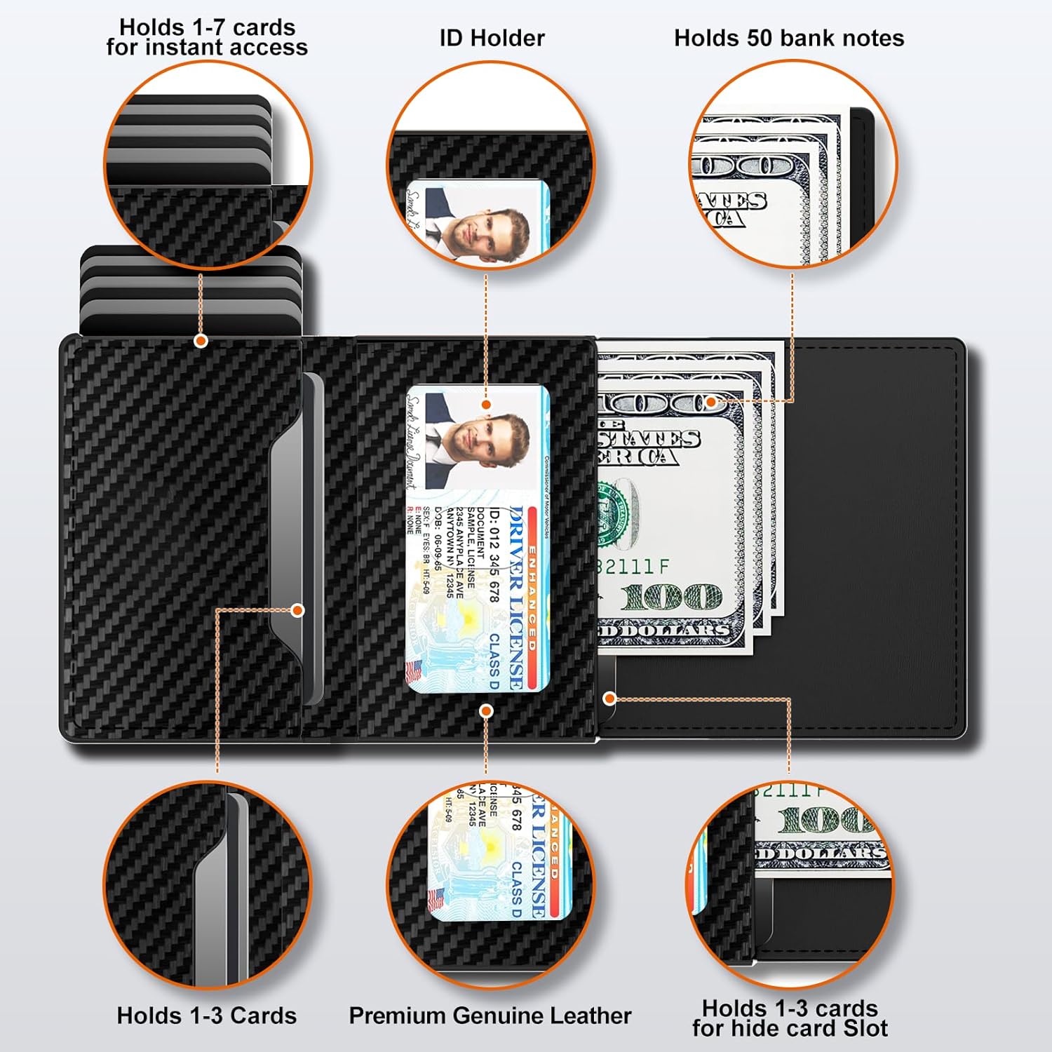- 【Top Cowhide Carbon Fiber】We choose the real cowhide material and 6063 T5 Aluminum with higher cost and stronger durability. In this way, it not only come with comfortable touch, but also sturdy enough with 6 years guarantee that the wallet will not wear out or peel off. Trust us, time will tell !