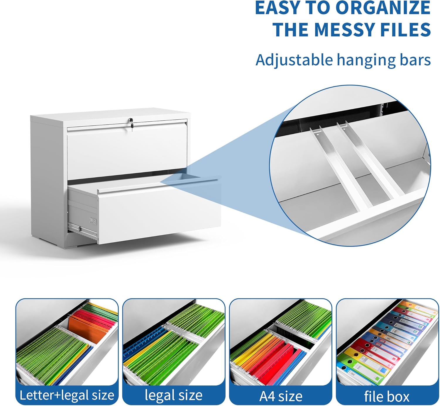 - 【Large Storage Capacity】: The office file cabinets have large capacity drawers that can hold legal, letter, A4; file box and F4 size hanging folders, this metal file cabinet is perfect for organizing your files and documents. The adjustable hanging bars allow you to customize the drawers to your specific needs, ensuring that everything stays in place and within easy reach.