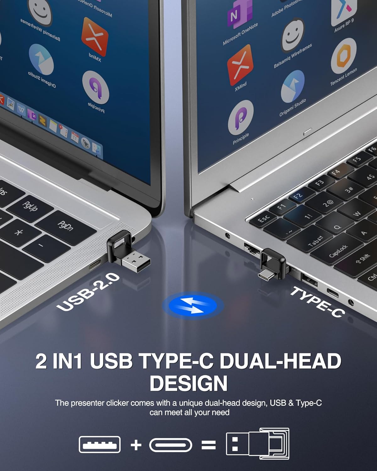 - 【2-IN-1 USB Type C Receiver 】The presenter clicker comes with a unique dual-head design, USB & TYPE-C can meet all your need. You can smoothly switch between different port devices such as Mac, laoptop and pc, one for multiple computers. At the bottom of the slide clicker there is a magnet which can hold your USB dongle securely