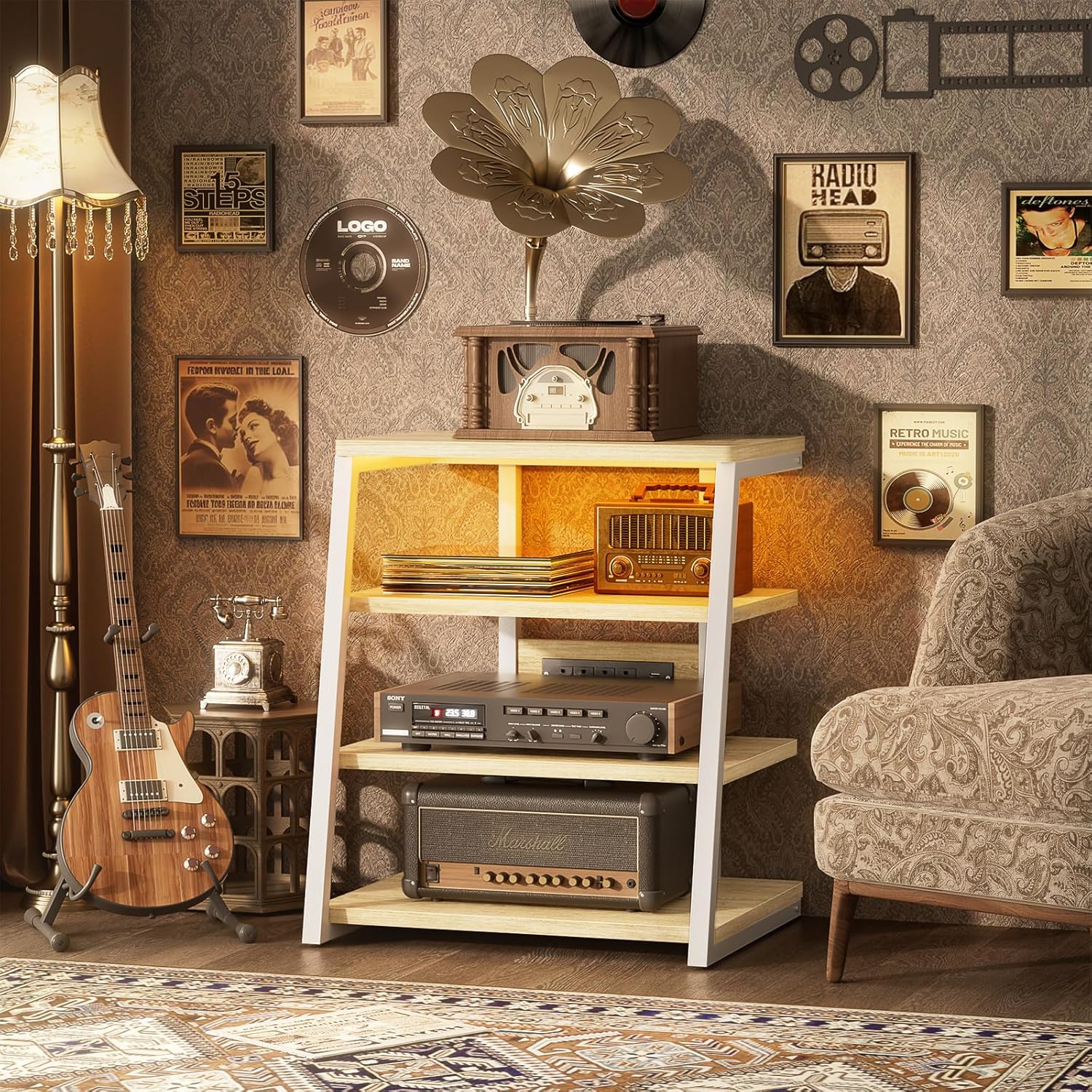 AV Media Stand with Outlets, Media Console with LED Lights, Stereo Racks and Stands with Storage Shelves, Media Audio Tower Cabinet, Natural Oak and White