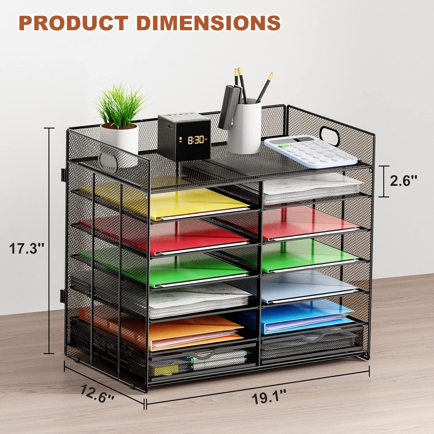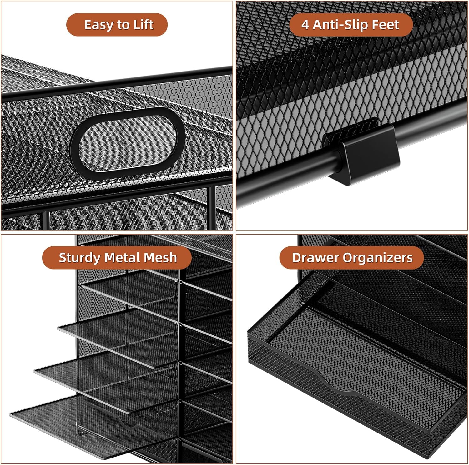 Marbrasse 7 Tier Desktop Literature Organizer, Mesh Paper Organizer, Desk Organizers with Drawer, File Sorter Mail Center Paper Storage Cabinet Classroom Keepers Mailbox for Office Home School (Black)