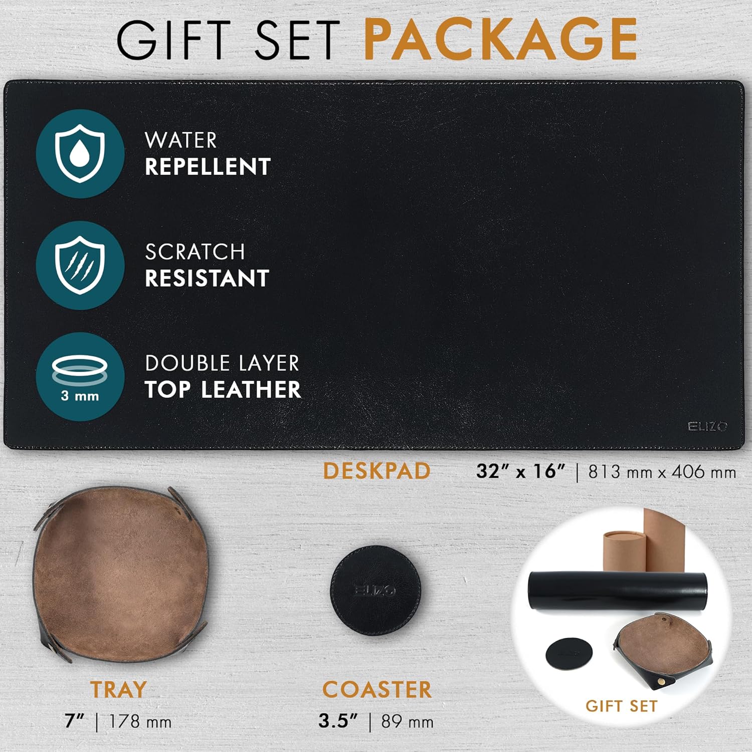 Elizo Leather Desk Mat Desk Pad Blotter Set - Real Full-Grain Leather (32x16) 2-Layer Genuine Desk Cover Protector & Large Mouse Pad | Computer Keyboard Desk Accessories for Office & Home