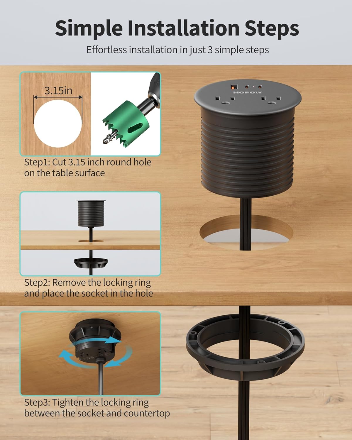 - 【Easy Install Power Grommet】Fits seamlessly into a standard 3.15-inch desk hole grommet. Simply cut a 3.15-inch hole in the desktop and insert the power supply grommet into it, then lock the locking ring tightly.