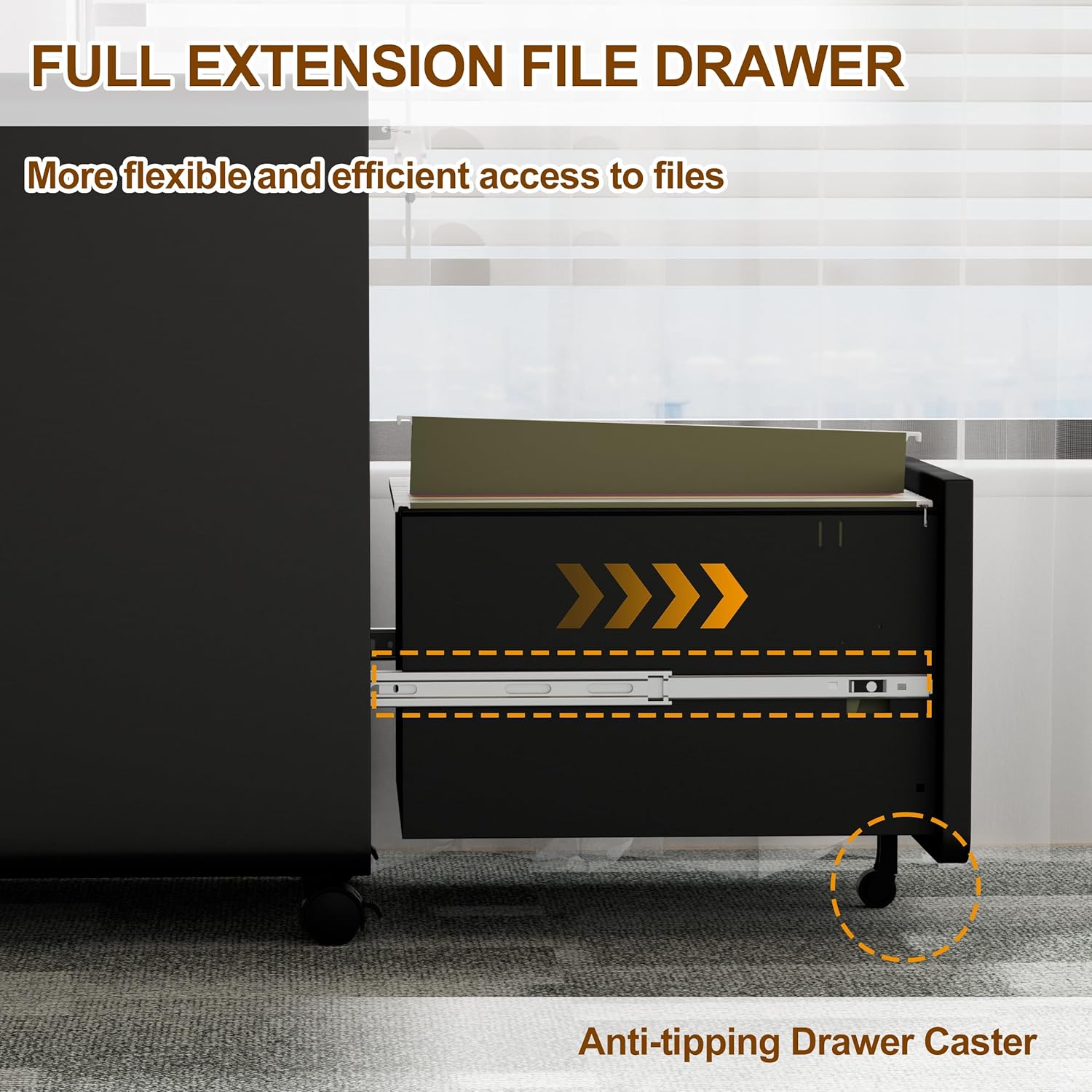 - [5 360°Swivel Casters,Synchronous Lock Security System]:LVSTEEL filing cabinet is equipped with 2 locking casters, 2 360° swivel casters and 1 anti-tilt wheel to ensure flexible movement and stability and safety. At the same time, the synchronous lock security system on the top can lock three drawers at one time and comes with four keys, effectively protecting the safety of internal documents and personal belongings.