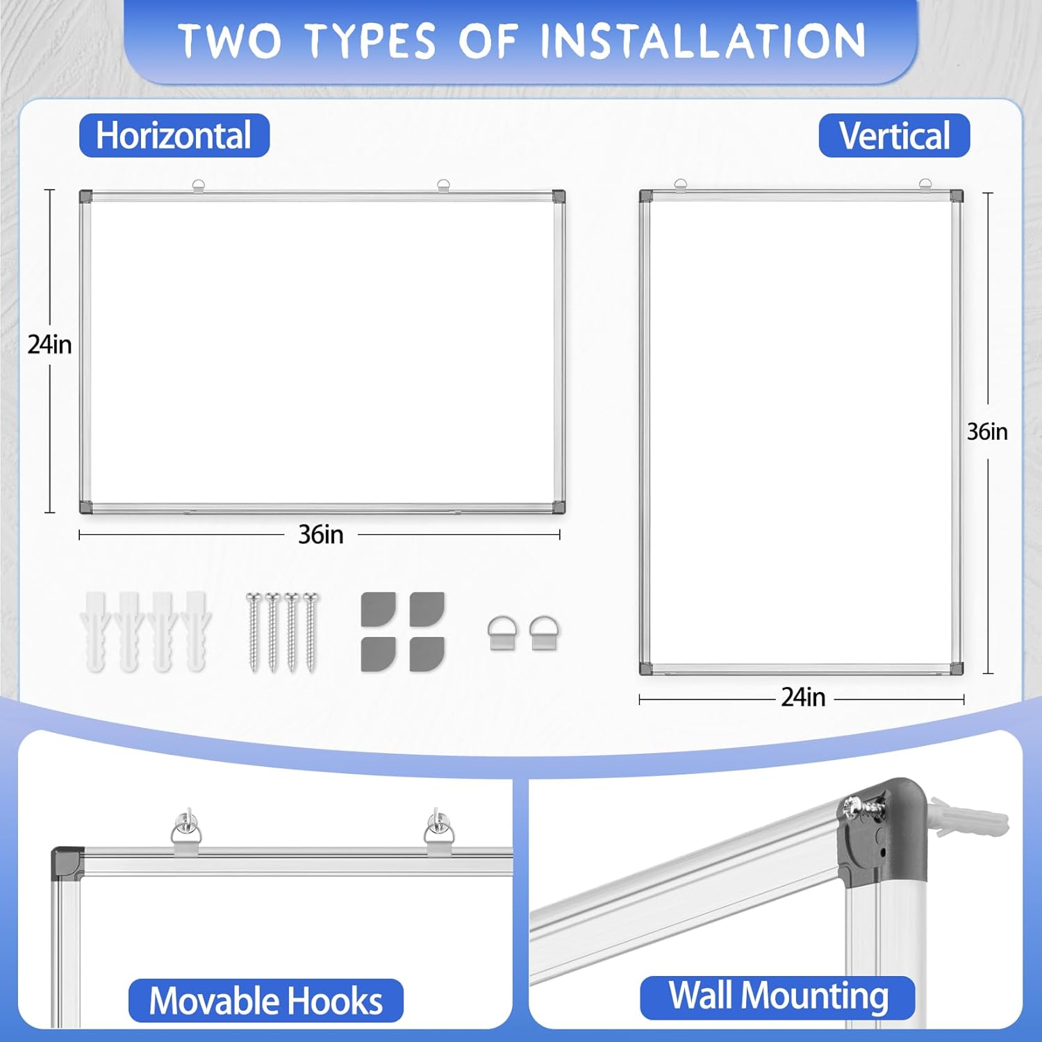 - 🧲Flexible Installation: Flexible installation options allow you to easily hang it using the included removable hook or nail it to the wall using the included mounting accessories for vertical or horizontal installation. Easily customize the white board's orientation to suit your space and needs