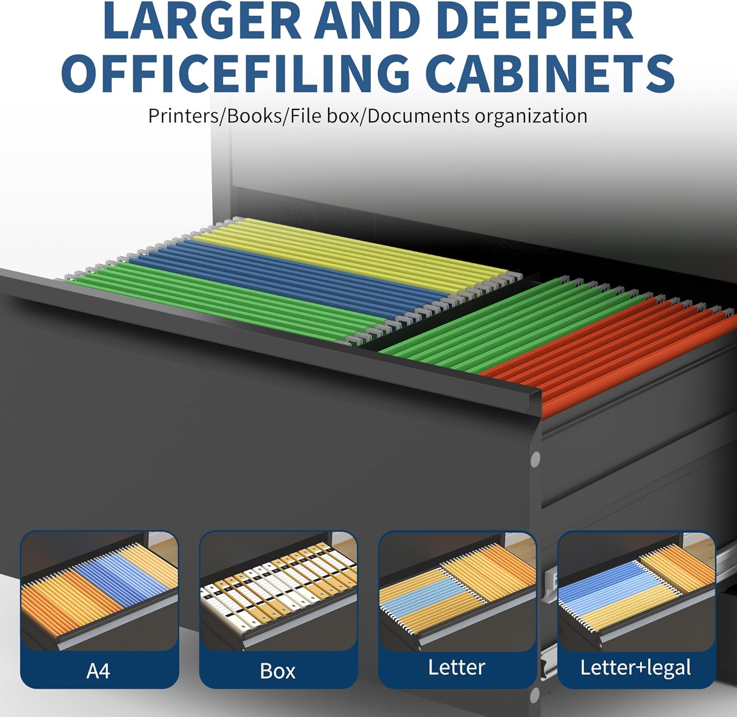 - ăVersatile Storageă This file cabinets for home office is designed for multiple uses. Each drawer comes with a hanger-on clip, accommodating legal, letter, and A4-sized documents or file boxes.