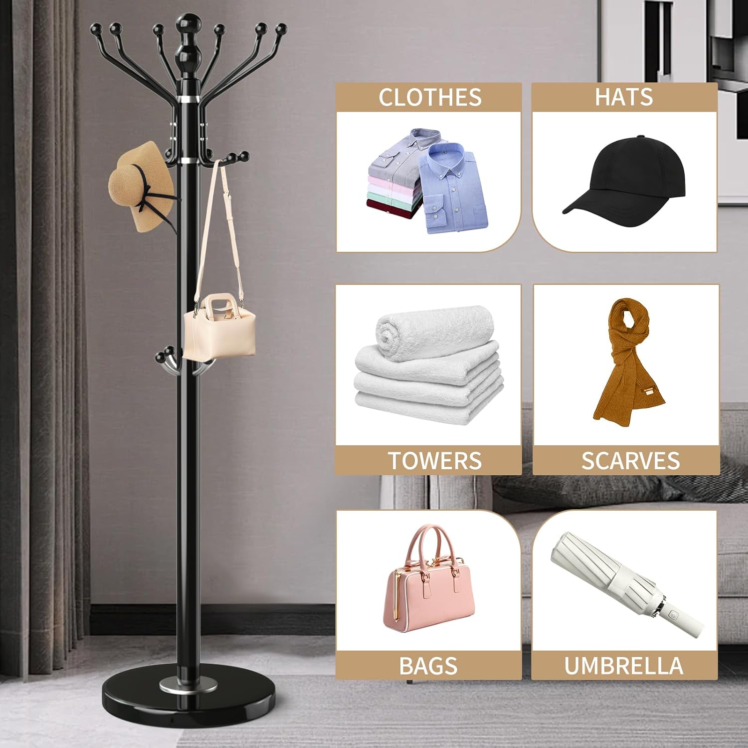 - METAL COAT RACK:LOZABEE metal coat rack has a unique and innovative design with a simple and stylish modern style. With high stability and strong load bearing, this coat racks can support multiple heavy outer clothes and bags at the same time.16 multifunctional hooks not only meet your daily needs, but also each hook has delicate small balls to take care of your clothes from scratching. You can reach your clothes easily