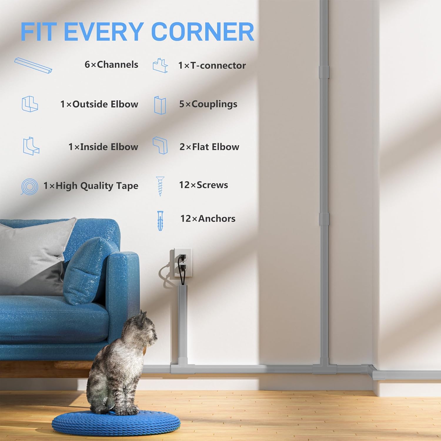 - Meets the Needs of Most Households Cable Management: The large-size grey cord hiders are ideal for hiding 3-4 TV/Audio/Network cables, such as HDMI cables, Cat6 Ethernet cables, optical cables, and USB cables. The Delamu snap-on design cord covers kit has 6 cable hiders, 15.7 inches long each. The grey wall cord hider is 94.5 inches long in total. There are 10 different connectors (to fit each corner), 12 screws and 12 anchors, and 1 adhesive tape