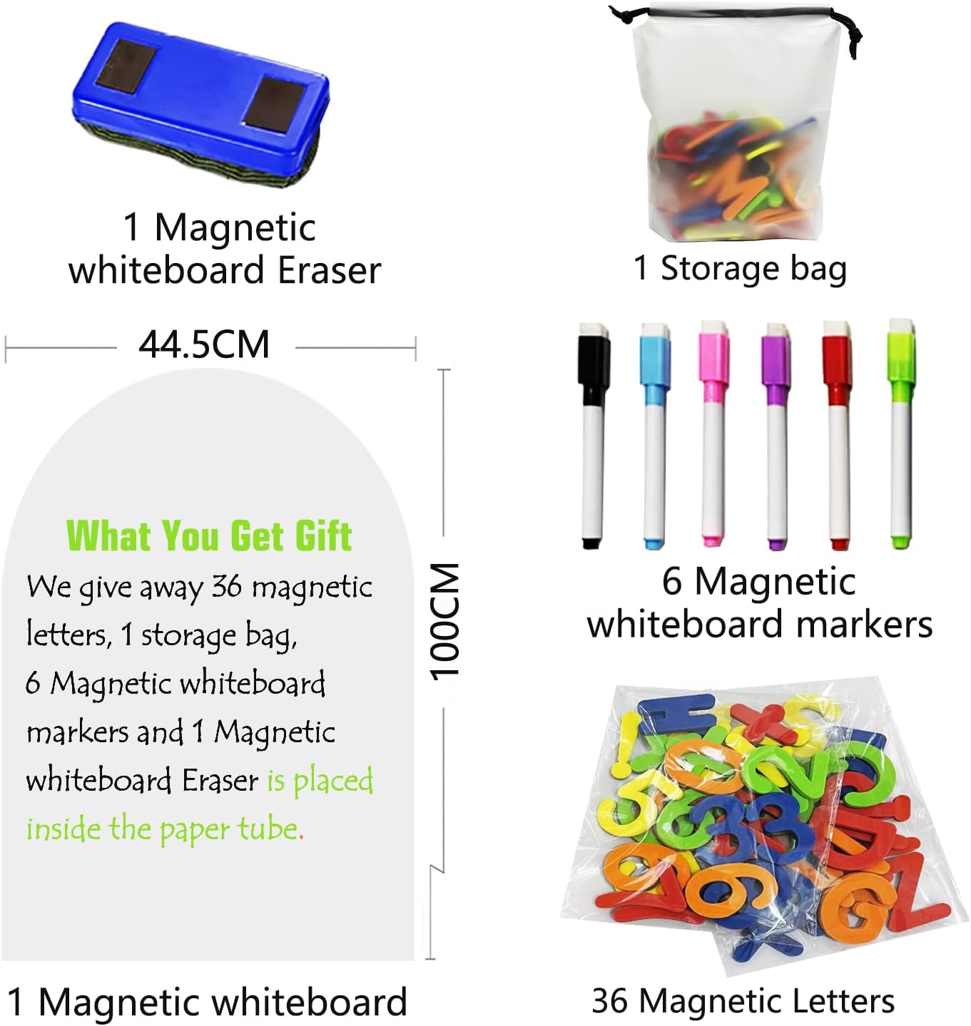 - VALUE - FOR - MONEY SET: It is a carefully prepared creative starting set! It contains 1 unique arc - shaped magnetic whiteboard sticker that showcases creative aesthetics. Paired with 1 magnetic dry - erase board with strong decontamination ability. There are 6 high - quality magnetic dry - erase pens, which write smoothly. With just a gentle wipe on the dry - erase board, the writing disappears instantly. Moreover, there are 36 magnetic letters and numbers. they are suitable for vocabulary teaching and spelling practice. Finally, there is 1 magnetic letter storage bag to keep everything in order. Start your creative journey right away.