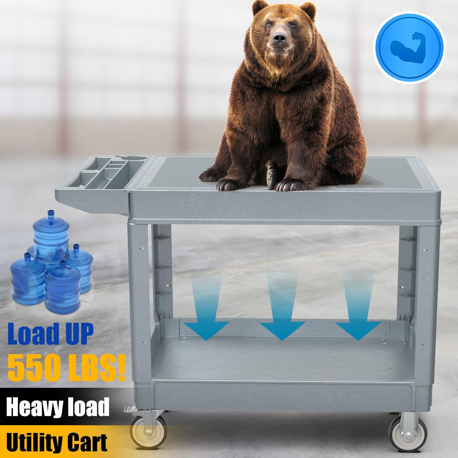 2 Tier Rolling Utility Cart on Wheels, 550 lbs Capacity Flat Top Plastic Service Cart with Lipped Shelves, 46 x 26-Inch Heavy Duty Work Cart for Warehouse, Garage, Cleaning, Gray