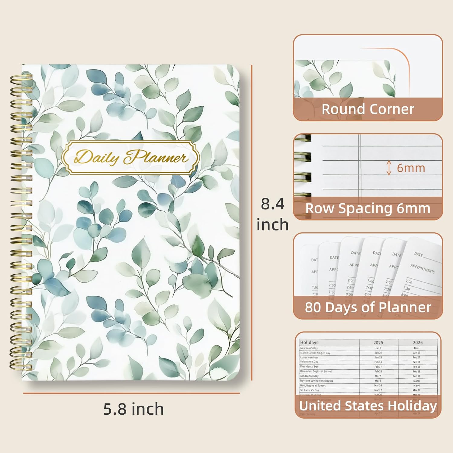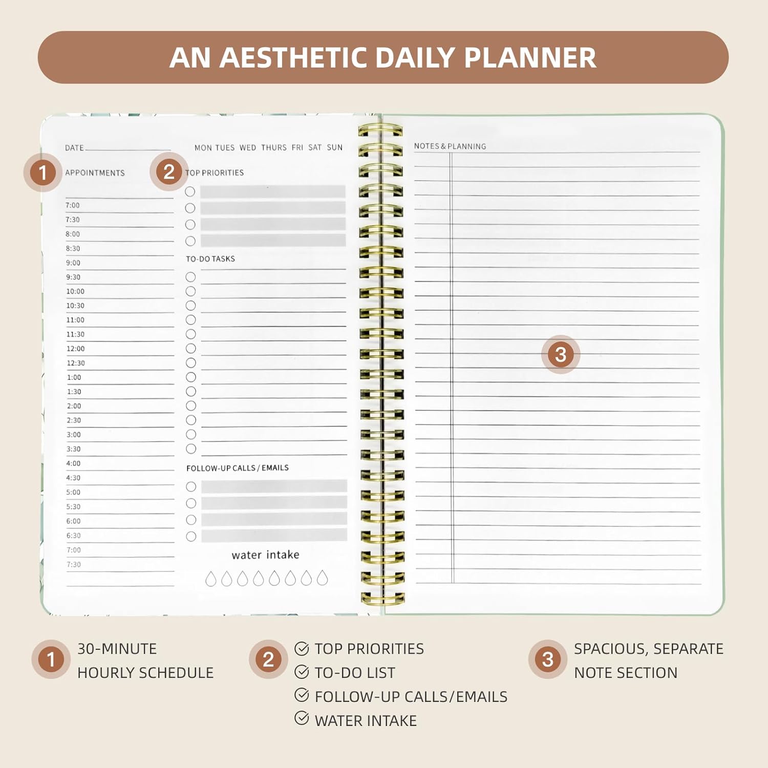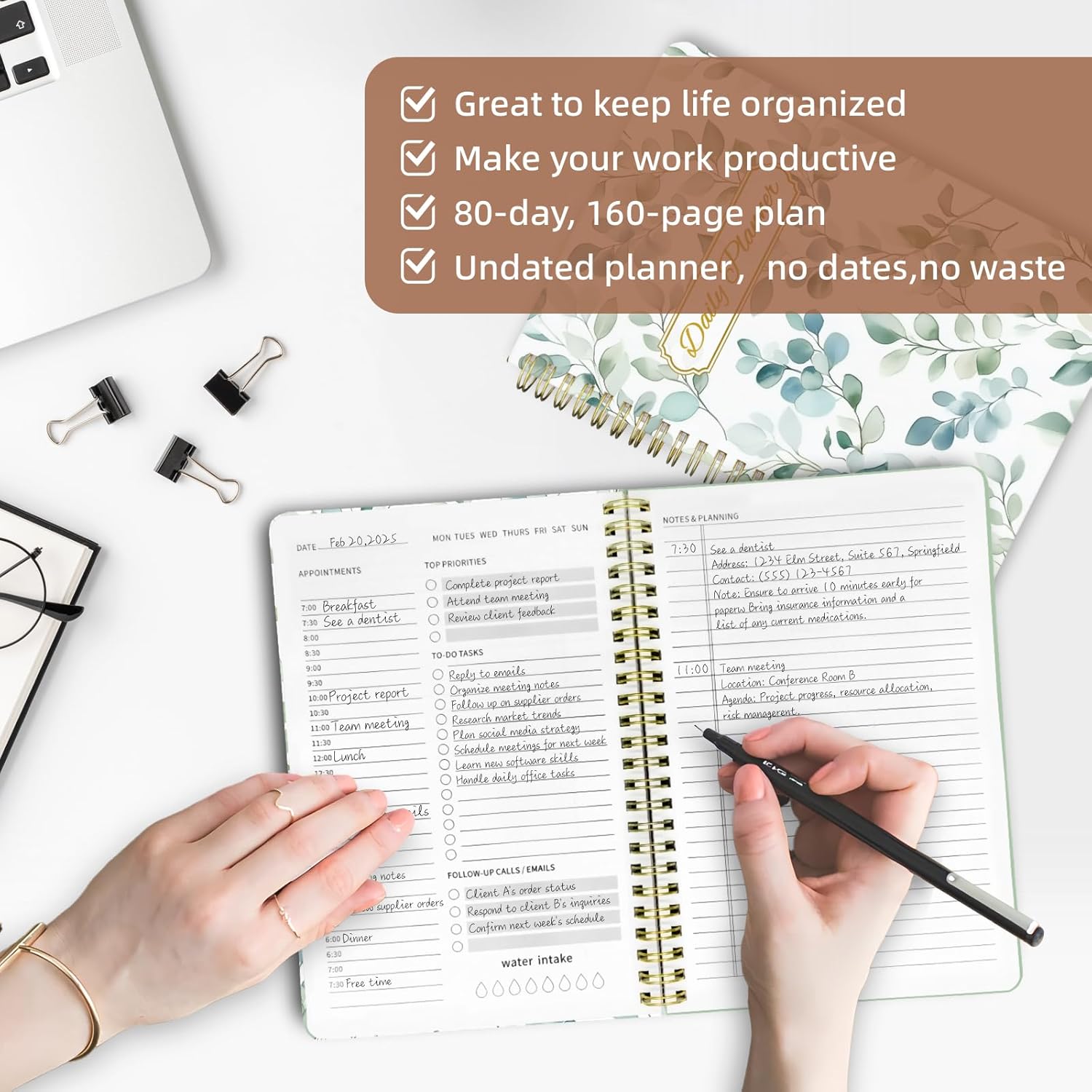 Undated Daily Planner - Spiral Notebook 80 Days One Day Per Page, Hourly Schedule, To-Do List, Notes, Everyday Planning Task, A5 Hardcover Journal Organizer Book Women Cute Aesthetic, Spring