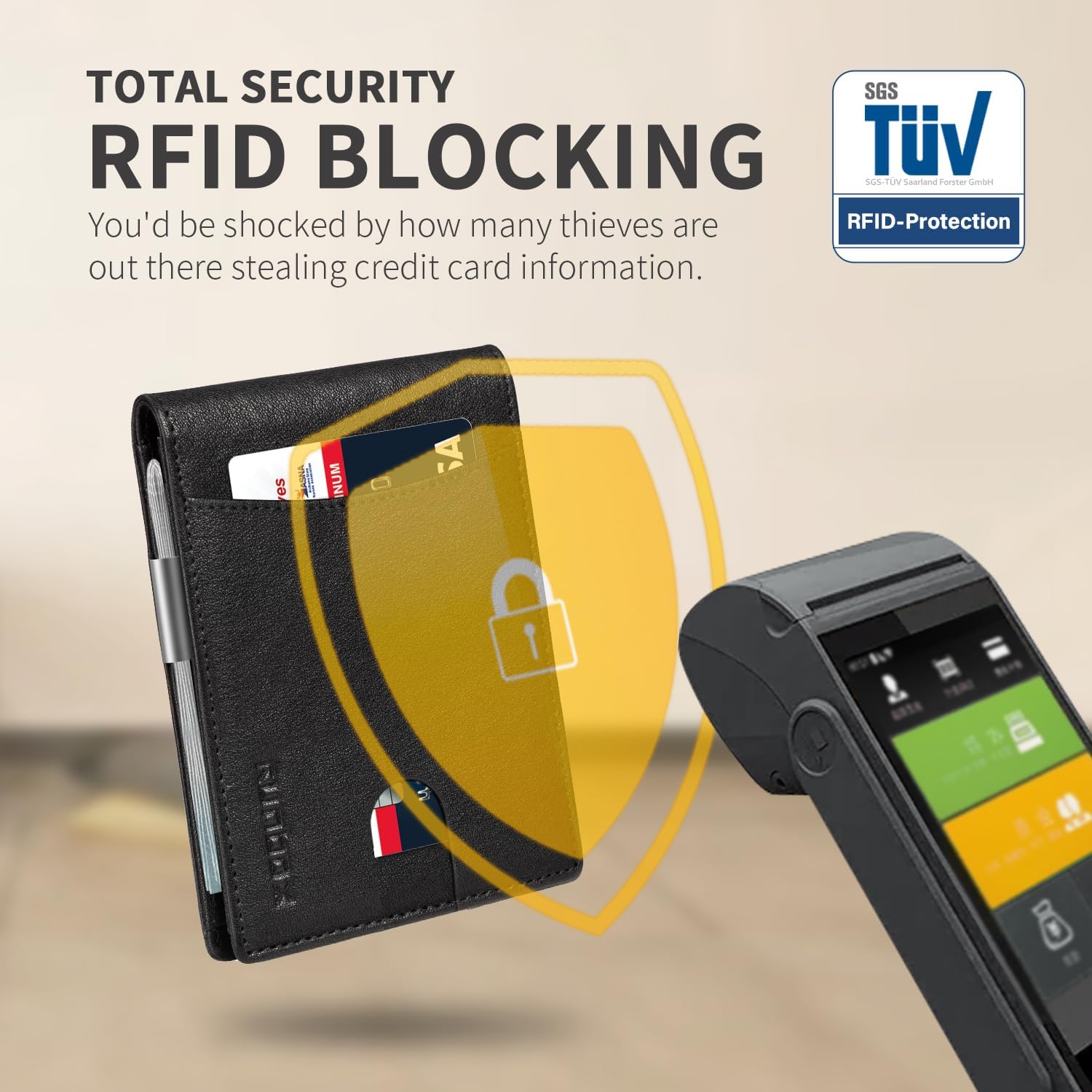 - RFID Anti-Theft SECURITY - This slim wallet for men is equipped with German Institute Certified RFID Security technology, a unique metal composite, engineered specifically to block 13.56 MHz or higher RFID signals to protect the valuable information and privacy