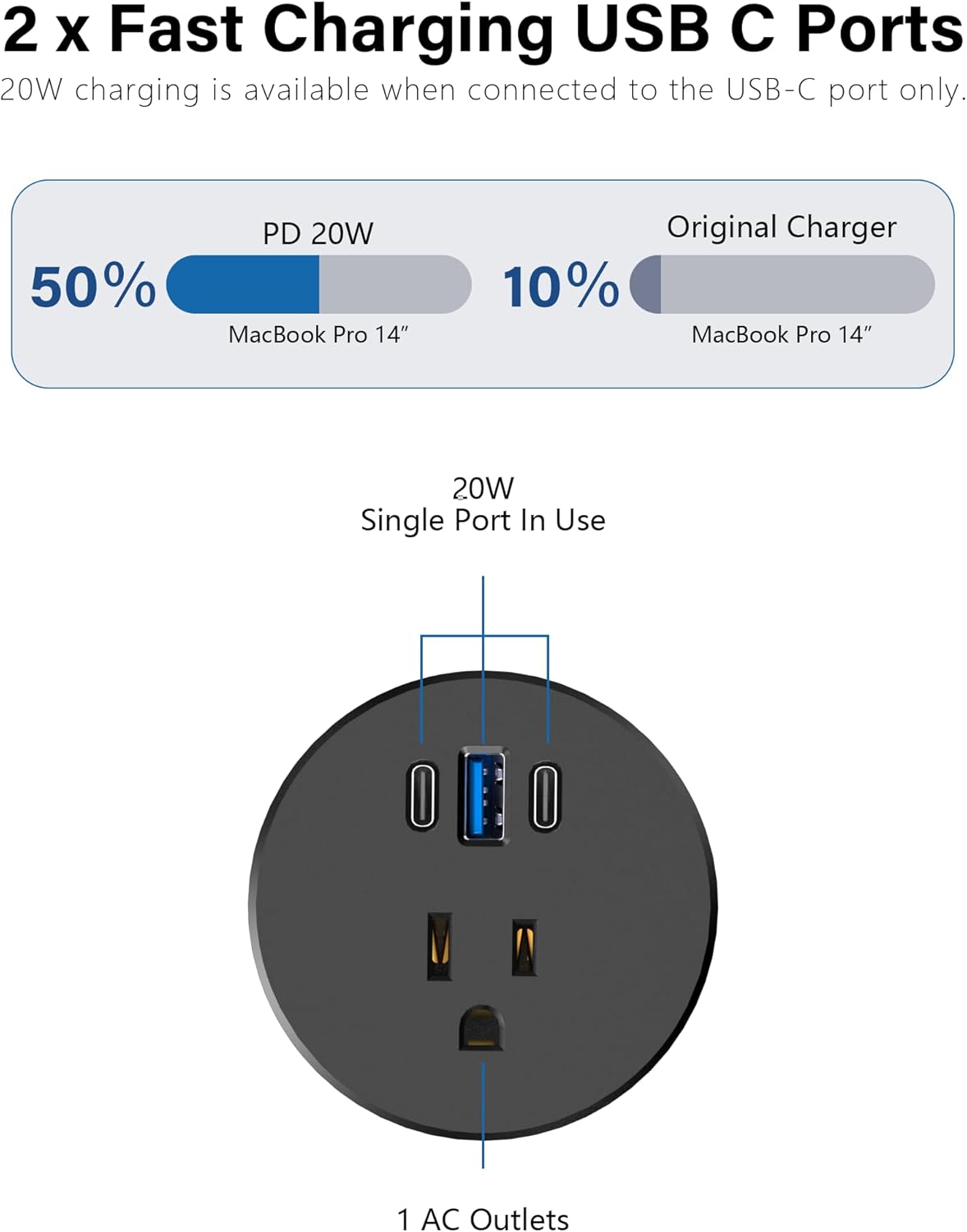- Desk Hole Grommet with PD 20W USB-C: Built-in USB-C charging port on the top of the desk power strip.