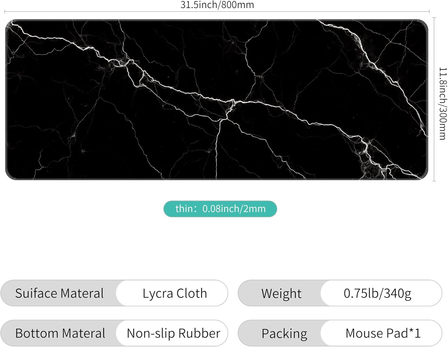 Dynippy Thin Extended Gaming Mouse Pad (31.5 * 11.8 * 0.08 inch) with Stitched Edges Large Mousepad Long XXL Keyboard and Mouse pad Desk Mat for Gaming Office & Home - Black White Marble