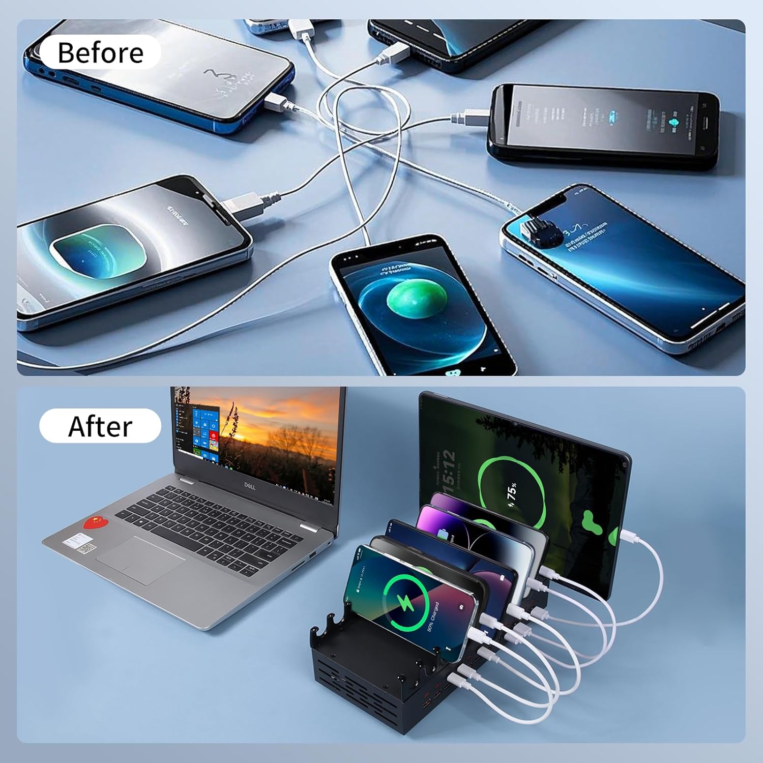 - đ§ăSturdy One-Piece Iron DesignăBuilt to Last with Heavy-Duty Iron Construction - Unlike flimsy plastic charging stations, our multi-port charger features durable iron slots for long-lasting strength. The wide, case-friendly slots fit phones and tablets of all sizesâeven with thick cases. Keep your desk, countertop, or nightstand clutter-free and stylish
