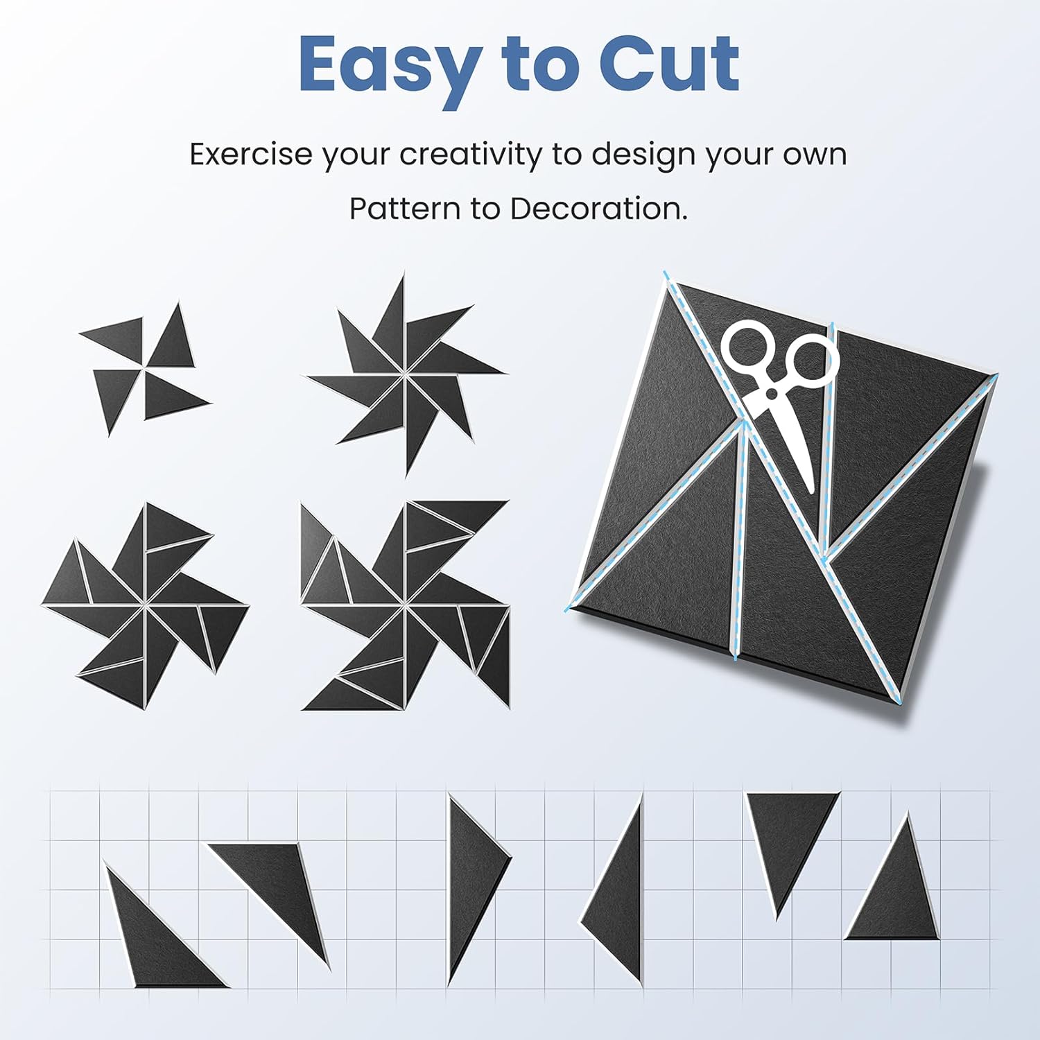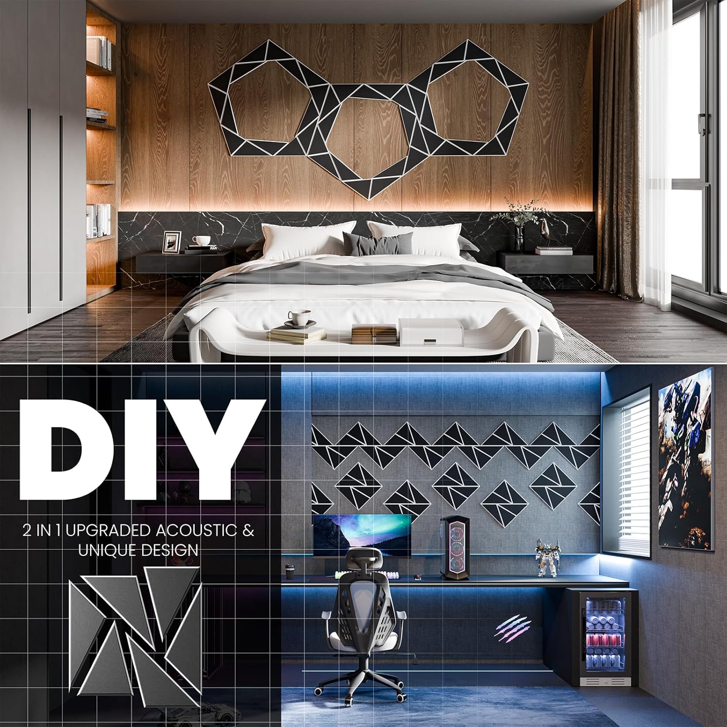 - 【Perfect for wall decoration】Be different from other acoustic panels,We have not only upgraded their acoustic performance,but aslo their appearance.Adopt beveled edge and multi-line design.They can be DIY into pinwheel patterns and multi-ring patterns.They absorb unnecessary sound while playing a good role in decorating the wall.Perfect for professional studios, video blogger,game room, podcasting, school,home theaters,offices,etc