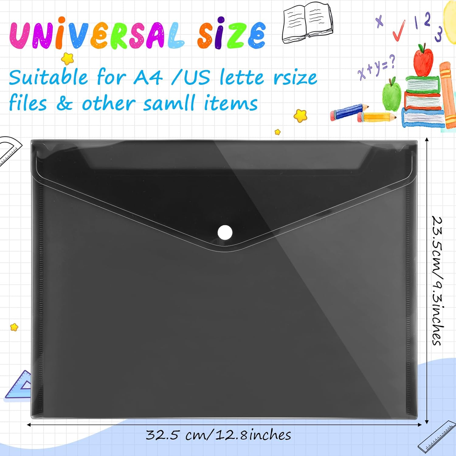 - Suitable Size: our transparent plastic envelopes measure about 12.8 x 9.25 inches, suitable for A4 size paper, allowing you to put many things into the folder, can tightly protect your important documents while being easy to access. Black design can protect your files and privacy to a certain extent