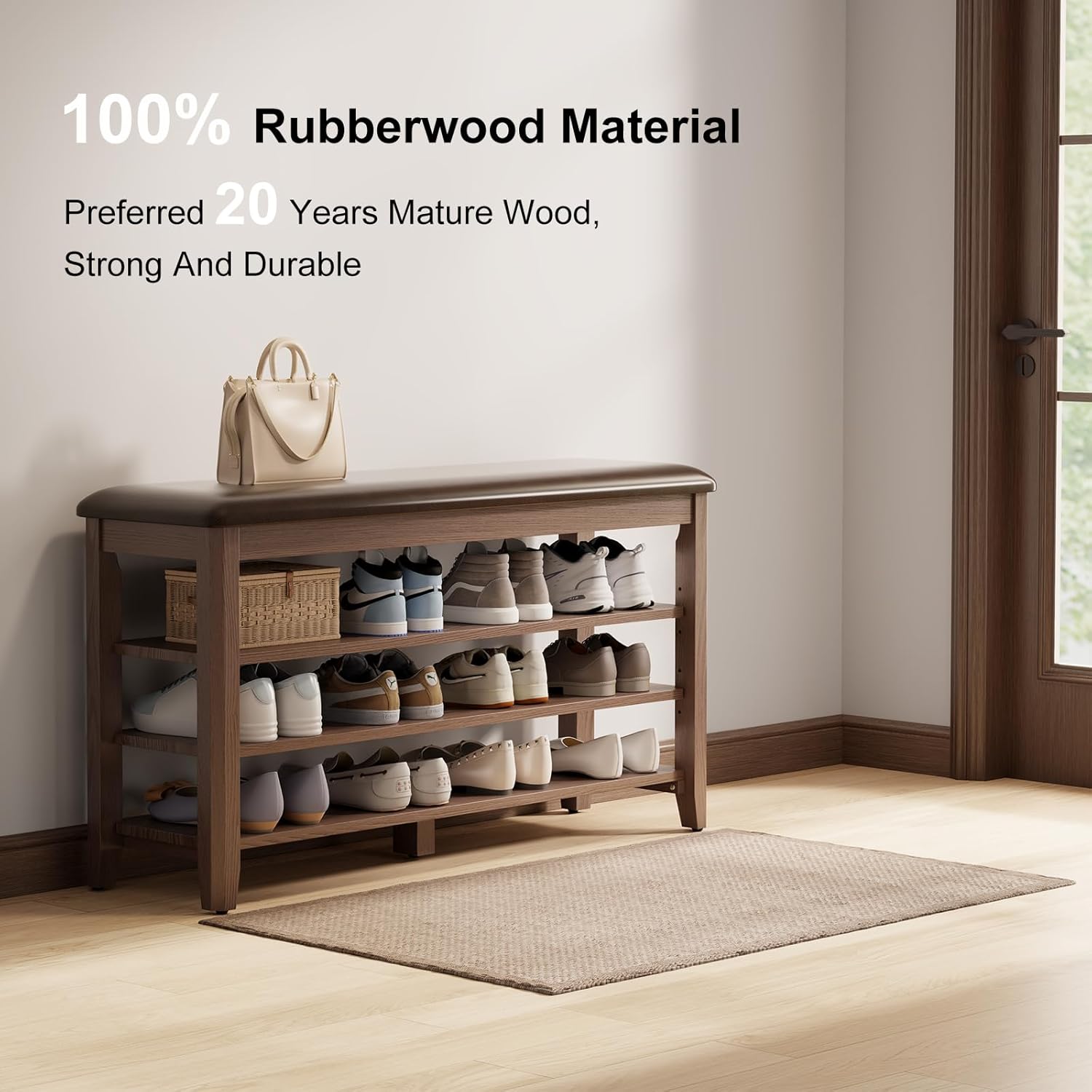 Shoe Bench with Leather Cushion, 3 Tiers Shoe Storage Bench Height Adjustable, Walnut Wood Entryway Bench for Hallway, Mudroom