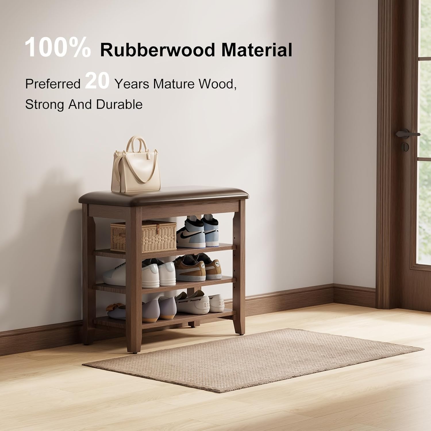 - Durable Rubberwood Construction:Made from 100% sturdy rubberwood, this entryway bench can support up to 500 lbs, making it ideal for entrances, hallways, and mudrooms. Its robust frame ensures long-lasting stability.