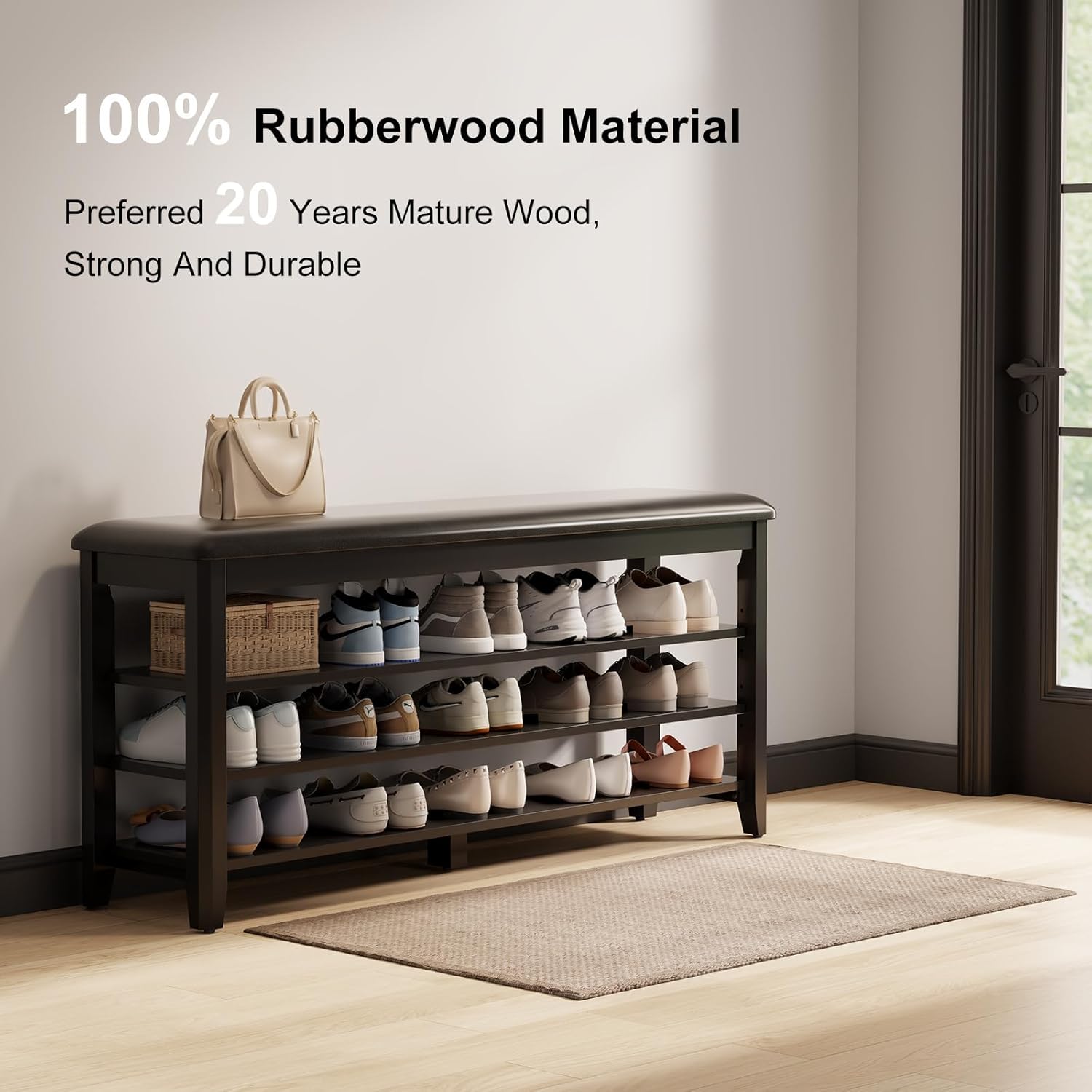 Shoe Bench with Leather Cushion, 3 Tiers Shoe Storage Bench Height Adjustable, Walnut Wood Entryway Bench for Hallway, Mudroom